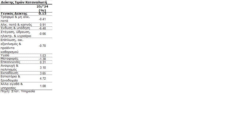 Όπως φαίνεται και από τον πίνακα, τη μεγαλύτερη μείωση στις τιμές το 2025 είχε ο τομέας ένδυσης και υπόδησης (-6,48%). Μειωμένες κατά 1,38% ήταν και οι τιμές στον τομέα των μεταφορών ενώ μικρότερη ήταν η μείωση των τιμών στον τομέα επίπλωσης, οικιακού εξοπλισμού και προϊόντων καθαρισμού (-0,7%). Στα τρόφιμα και μη αλκοολούχα ποτά η μείωση ήταν 0,41%.