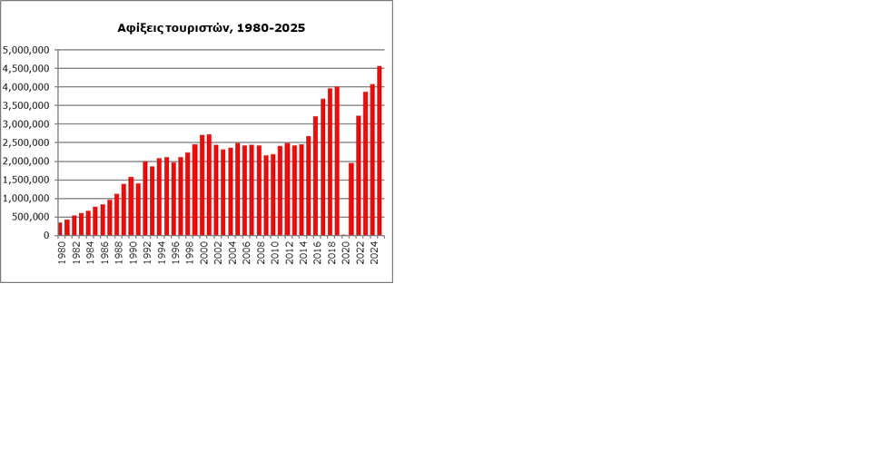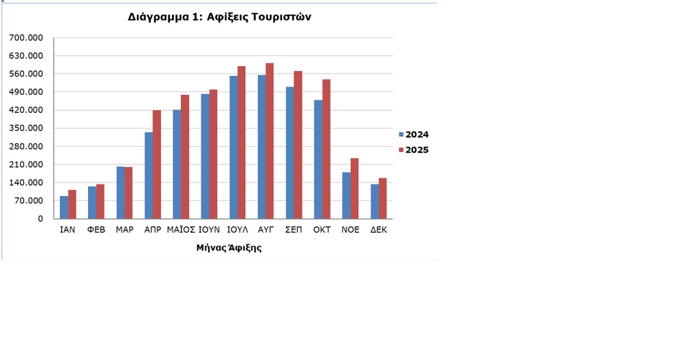 Σύμφωνα με στοιχεία τη Στατιστικής Υπηρεσίας, για την περίοδο Ιανουαρίου – Δεκεμβρίου 2025, οι αφίξεις τουριστών ανήλθαν σε 4.534.073 σε σύγκριση με 4.040.200 την αντίστοιχη περίοδο του 2024, σημειώνοντας αύξηση 12,2%.