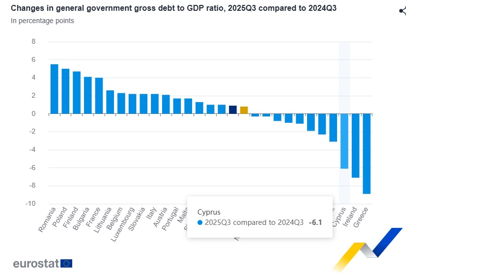 Το δημόσιο χρέος της Κύπρου μειώθηκε στο 60,6% του ΑΕΠ από 61,4% το δεύτερο τρίμηνο του 2025 και 66,7% το τρίτο τρίμηνο του 2024.