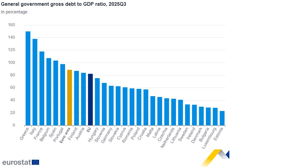 Οι υψηλότεροι δείκτες δημόσιου χρέους προς ΑΕΠ στο τέλος του τρίτου τριμήνου του 2025 καταγράφηκαν στην Ελλάδα (149,7%), την Ιταλία (137,8%), τη Γαλλία (117,7%), το Βέλγιο (107,1%) και την Ισπανία (103,2%), ενώ οι χαμηλότεροι καταγράφηκαν στην Εσθονία (22,9%), το Λουξεμβούργο (27,9%), τη Βουλγαρία (28,4%) και τη Δανία (29,7%).
