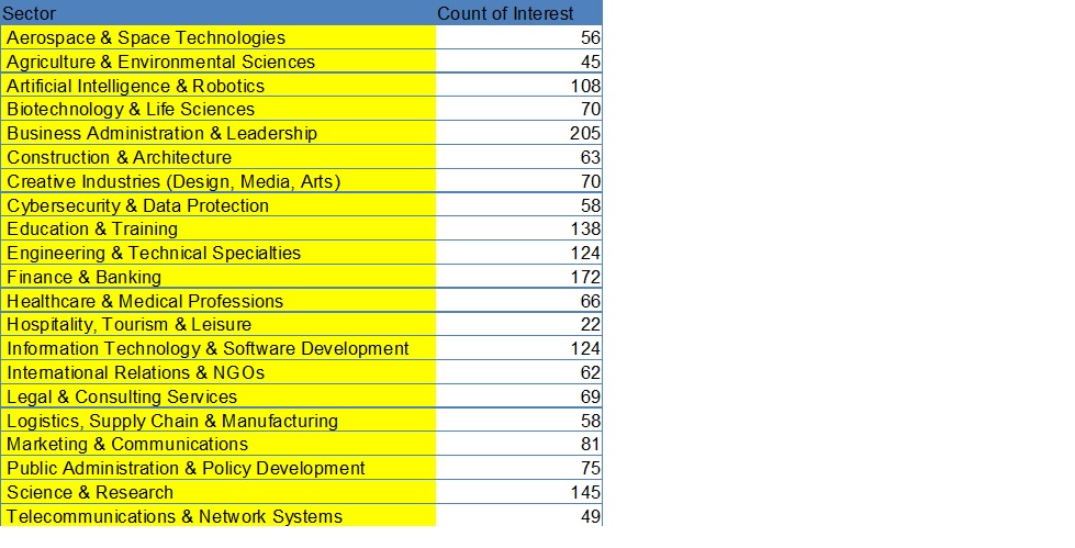 Πιο κάτω παρατίθενται οι τομείς ενδιαφέροντος των εγγεγραμμένων χρηστών. Σημειώνεται ότι το άθροισμα υπερβαίνει τον αριθμό των χρηστών, καθώς κάθε χρήστης έχει τη δυνατότητα να δηλώσει περισσότερους από έναν τομείς ενδιαφέροντος.