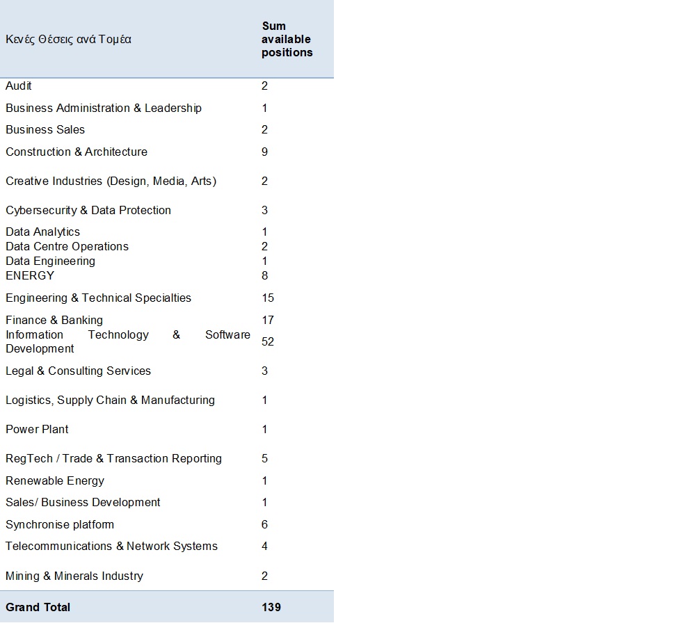 Συνολικός αριθμός δημοσιευμένων θέσεων εργασίας: 51 εταιρείες, 99 δημοσιεύσεις, 139 θέσεις