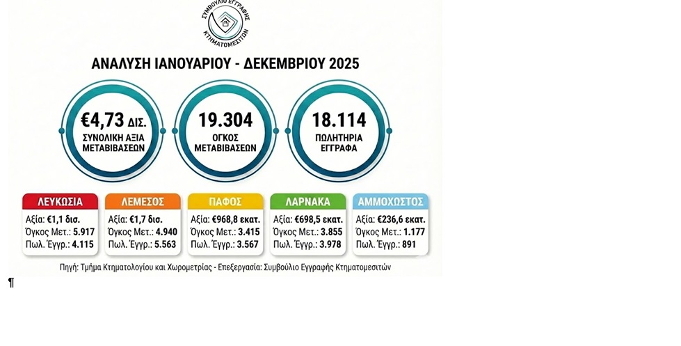 Θετικό ήταν το πρόσημο του 2025 για την αγορά ακινήτων στην Κύπρο. Οι επιδόσεις που καταγράφηκαν αποτυπώνουν την μεγάλη δυναμική, που αναπτύχθηκε καθώς σε ετήσια βάση σημειώθηκε αύξηση της τάξης του 15% στον αριθμό των πωλητηρίων εγγράφων, που κατατέθηκαν Παγκύπρια την περίοδο Ιανουαρίου - Δεκεμβρίου. Όπως καταδεικνύουν τα στοιχεία του Τμήματος Κτηματολογίου και Χωρομετρίας, τα οποία επεξεργάζεται και παρουσιάζει σε τριμηνιαία βάση το Συμβούλιο Εγγραφής Κτηματομεσιτών, το 2025 κατατέθηκαν συνολικά 18.114 πωλητήρια έγγραφα σε σύγκριση με 15.797 το 2024. Όσον αφορά στις μεταβιβάσεις, καταγράφηκε μικρή αύξηση στον όγκο κατά 0,77%, αλλά μεγάλη αύξηση της τάξης του 10% περίπου στην αξία τους, η οποία ξεπέρασε τα €4,7 δισ.