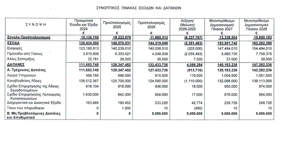 Ο προϋπολογισμός του 2026 που θα συζητηθεί σήμερα στην επιτροπή οικονομικών, προβλέπει δαπάνες ύψους €132,4 εκατ. σε σύγκριση με δαπάνες ύψους €128,3 εκατ. που ήταν η πρόβλεψη στον προϋπολογισμό του 2025.