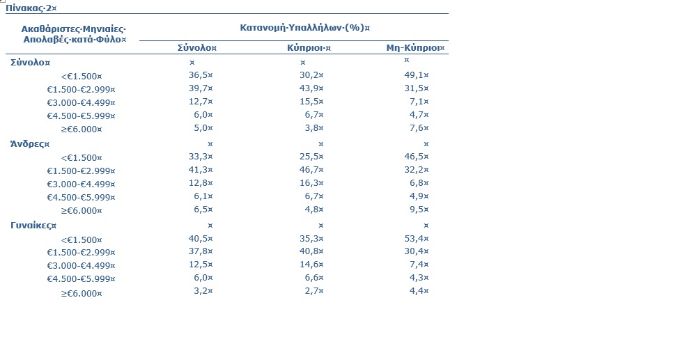 Στην κατηγορία των υψηλότερων απολαβών (≥€6.000) εντάσσεται το 3,8% των Κυπρίων υπαλλήλων, ενώ το αντίστοιχο ποσοστό για τους μη Κυπρίους ανέρχεται σε 7,6%.