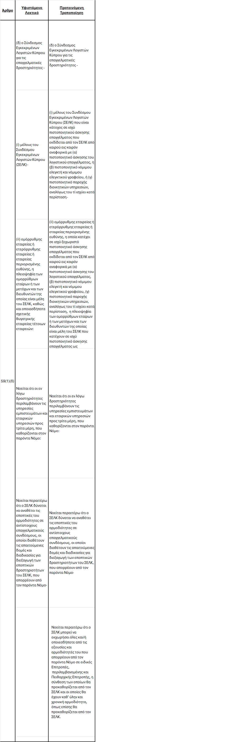 Προς τον σκοπό αυτό, ο ΣΕΛΚ εισηγήθηκε την αντικατάσταση του άρθρου 59(1)(δ) με νέο άρθρο και υπέβαλε τη σχετική εισήγηση στο πλαίσιο της εν εξελίξει διαδικασίας τροποποίησης του νόμου, η οποία τελεί στο στάδιο της δημόσιας διαβούλευσης, με καταληκτική ημερομηνία την 14η Φεβρουαρίου 2026.