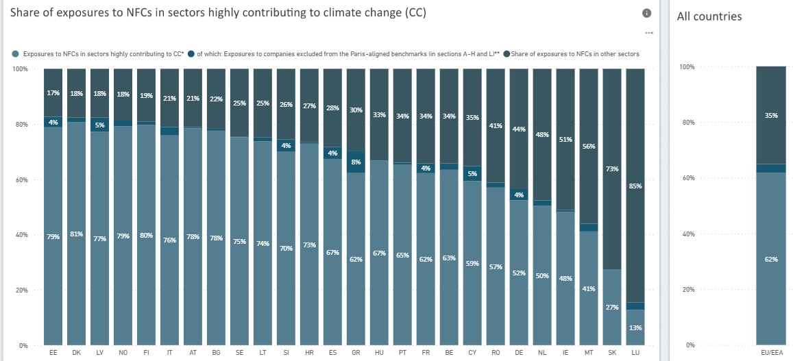 Οι εκθέσεις των ευρωπαϊκών τραπεζών σε τομείς που συμβάλλουν σημαντικά στην κλιματική αλλαγή παρέμειναν αυξημένες σε περίπου 62%, αντανακλώντας τη σημασία των κλιματικά ευαίσθητων βιομηχανιών στα μη χρηματοοικονομικά εταιρικά χαρτοφυλάκια τους, γεγονός που δικαιολογεί συνεχείς προσπάθειες για την ανάπτυξη και διατήρηση ισχυρών εργαλείων διαχείρισης κλιματικών κινδύνων και πλαισίων παρακολούθησης.