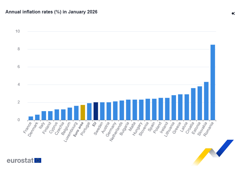 Ο ετήσιος ρυθμός πληθωρισμού στην ευρωζώνη επιβραδύνθηκε στο 1,7% τον Ιανουάριο του 2026, από 2,0% τον Δεκέμβριο. Ένα χρόνο νωρίτερα, ο ρυθμός ήταν 2,5%. Ο ετήσιος πληθωρισμός στην Ευρωπαϊκή Ένωση μειώθηκε στο 2,0% τον από 2,3% τον Δεκέμβριο. Ένα χρόνο νωρίτερα, ο ρυθμός ήταν 2,8%.