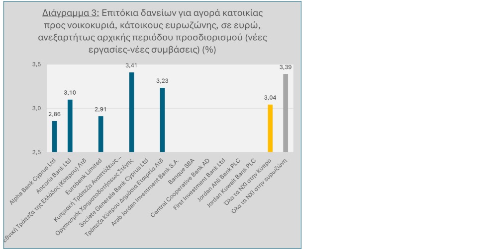 Όσον αφορά το μέσο επιτόκιο δανείων για αγορά κατοικίας προς νοικοκυριά, κάτοικους ευρωζώνης, σε ευρώ, ανεξαρτήτως αρχικής περιόδου προσδιορισμού(νέες εργασίες-νέες συμβάσεις), μειώθηκε στο 3,04% από 3,11%.