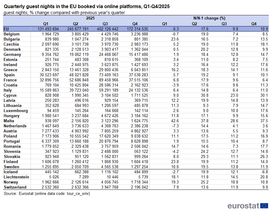 Τη δεύτερη μεγαλύτερη αύξηση στο σύνολο των χωρών της ΕΕ που έφθασε το 30,1%, κατέγραψαν το τέταρτο τρίμηνο το 2025 οι διανυκτερεύσεις σε κυπριακά καταλύματα που κρατήθηκαν μέσω των τριών διαδικτυακών πλατφορμών π...