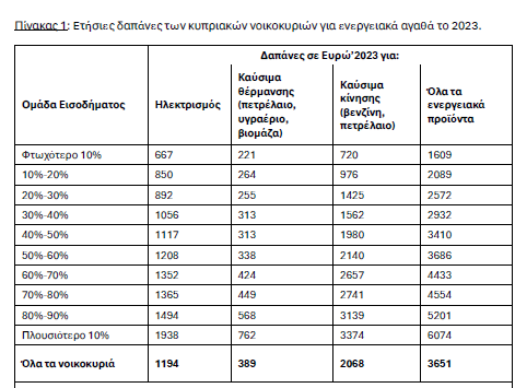 Τα στοιχεία της έρευνας φωτίζουν και μια δεύτερη, λιγότερο ορατή διάσταση: το πώς κατανέμεται το ενεργειακό κόστος στην κοινωνία.  Σύμφωνα με τα δεδομένα, το 2023 ένα μέσο κυπριακό νοικοκυριό δαπανούσε περίπου 3.651 ευρώ ετησίως για ενέργεια, ποσό που αντιστοιχεί στο 7,5% του εισοδήματός του.