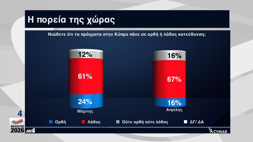 Η δημοσκόπηση της εταιρείας η οποία κάλυψε μια γενικώς μεγάλη περίοδο από τις 6/04/2026 -17/04/2026, με δείγμα 1009 ατόμων, δεν παρουσιάζει ιδιαίτερες αυξομειώσεις σε σχέση με τα ευρήματα για την πορεία ή το μέλλον της χώρας.