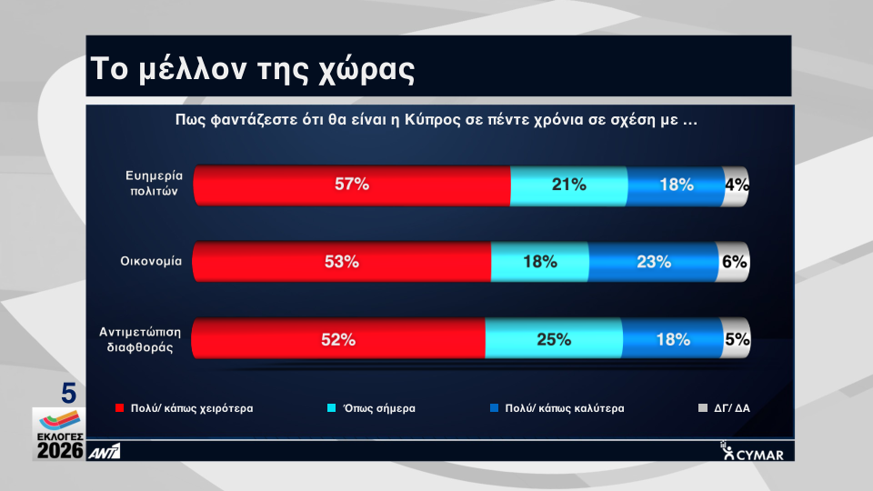 Στο παρεμφερές ερώτημα για το πως βλέπουν οι πολίτες το μέλλον της χώρας σε πέντε χρόνια από τώρα, το 49% των πολιτών θεωρούν ότι θα χειροτερέψει η «Κοινωνική Δικαιοσύνη», το 43% εκτιμά ότι η πολιτική σταθερότητα θα επιδεινωθεί ενώ σε σχέση με το κυπριακό πρόβλημα το 52% εκτιμά ότι θα κινηθούν καλύτερα τα πράγματα.