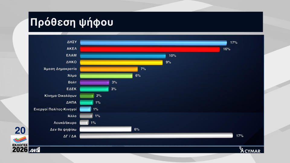 Στην πρόθεση ψήφου ο ΔΗΣΥ καταγράφει 17%, δύο μονάδες περισσότερες από τη μέτρηση του Μαρτίου. Το ΑΚΕΛ στη μέτρηση καταγράφει ένα 16%, παραμένοντας σταθερό σε σχέση με τον προηγούμενο μήνα. Στη τρίτη θέση έχει σταθεροποιηθεί το ΕΛΑΜ με ποσοστά στο 10% σε σύγκριση με 9%, ενώ με 9% ακολουθεί το ΔΗΚΟ το οποίο επίσης ανεβαίνει κατά μία μονάδα. Στην πέμπτη θέση βρίσκεται η Άμεση Δημοκρατία με 7% ενώ ακολουθεί το ΑΛΜΑ με 6%. Βολτ και ΕΔΕΚ στο 3%.