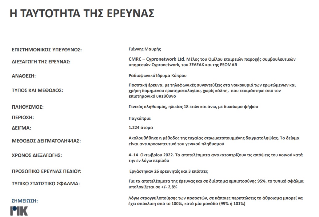 Τη διεξαγωγή της έρευνας ανέλαβε η εταιρεία CMRC – Cypronetwork για λογαριασμό του Ραδιοφωνικού Ιδρύματος Κύπρου. Η έρευνα ήταν ποσοτική, με τηλεφωνικές συνεντεύξεις στα νοικοκυριά των ερωτώμενων και χρήση δομημένου ερωτηματολογίου, χωρίς κάλπη, που ετοιμάστηκε από τον επιστημονικό υπεύθυνο, Γιάννη Μαυρή. Στη δημοσκόπηση συμμετείχαν 1.224 άτομα άνω των 18 ετών με δικαίωμα ψήφου. Το τυπικό σφάλμα υπολογίζεται σε +/- 2,8%, ενώ σημειώνεται ότι λόγω στρογγυλοποίησης των ποσοστών, σε κάποιες περιπτώσεις το άθροισμα μπορεί να έχει απόκλιση από το 100%, κατά μία μονάδα (99% ή 101%).