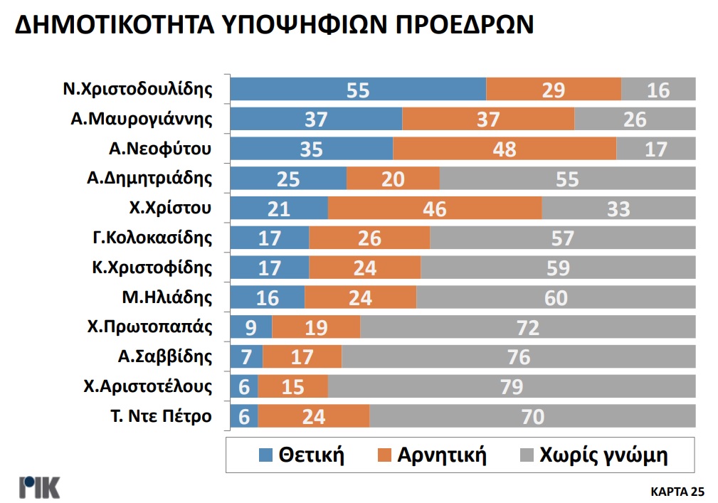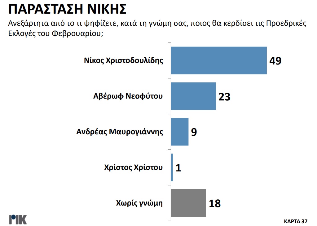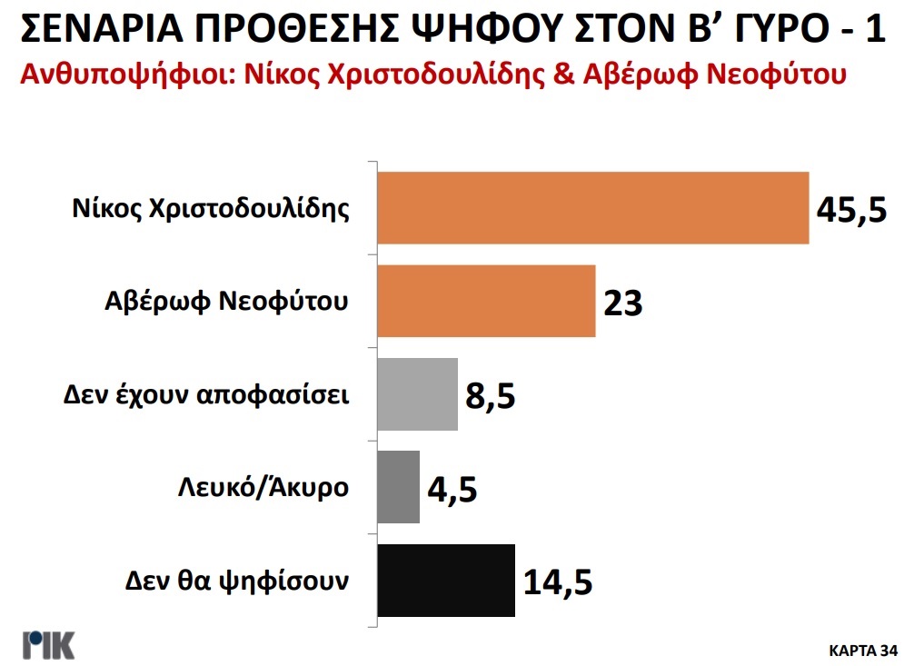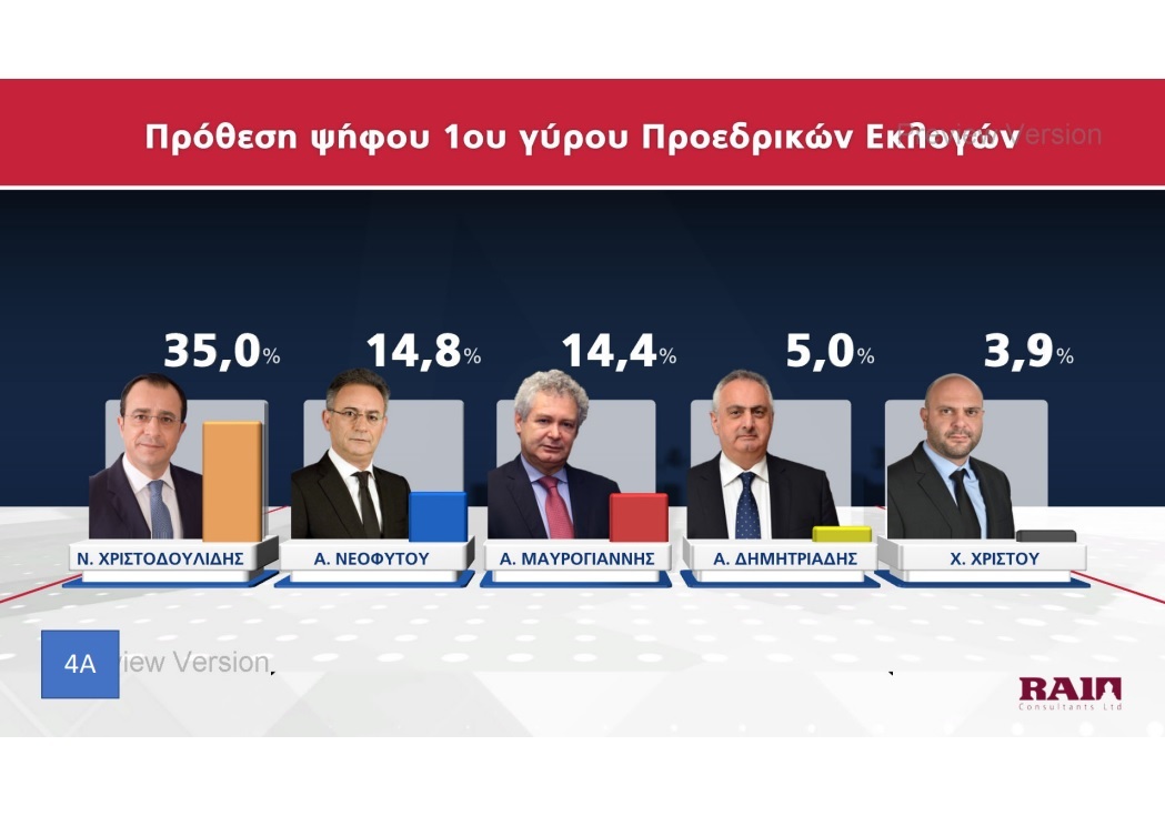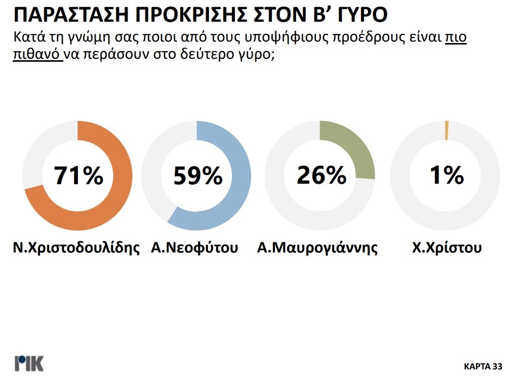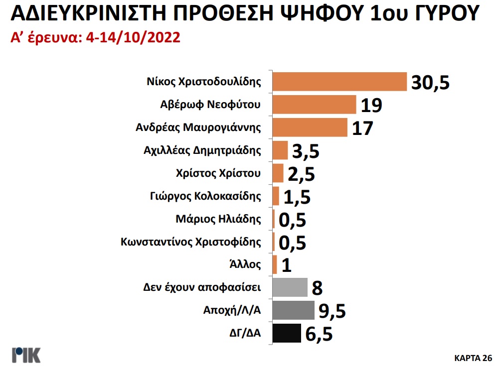 Παρουσιάστηκε το βράδυ της Πέμπτης 20 Οκτωβρίου η πρώτη δημοσκόπηση του ΡΙΚ για τις Προεδρικές Εκλογές. Μέσα από τα αποτελέσματα της δημοσκόπησης επιβεβαιώνεται η πρωτοπορία Νίκου Χριστοδουλίδη, με ένα ποσοστό της τάξεως του 30,5% στην πρόθεση ψήφου. Ακολουθούν Αβέρωφ Νεοφύτου και Ανδρέας Μαυρογιάννης με ποσοστά 19% και 17% αντίστοιχα. Ο τέως ΥΠΕΞ κερδίζει και στα δύο σενάρια του Β’ γύρου με αντίπαλο είτε τον πρόεδρο του ΔΗΣΥ είτε τον τέως διαπραγματευτή, ενώ στην περίπτωση που Αβέρωφ Νεοφύτου και Ανδρέας Μαυρογιάννης κόψουν πρώτοι το νήμα στον Α’ γύρο, αναμένεται μια σκληρή, κεφάλι με κεφάλι, μάχη.
