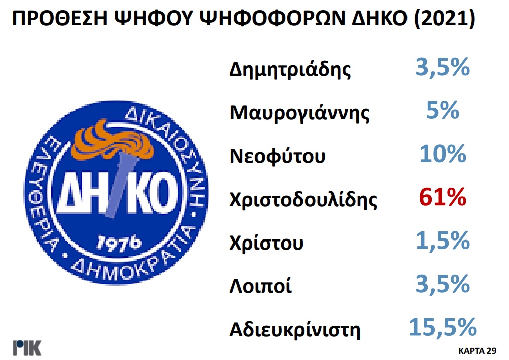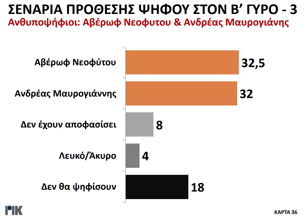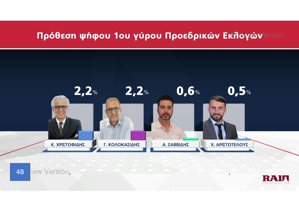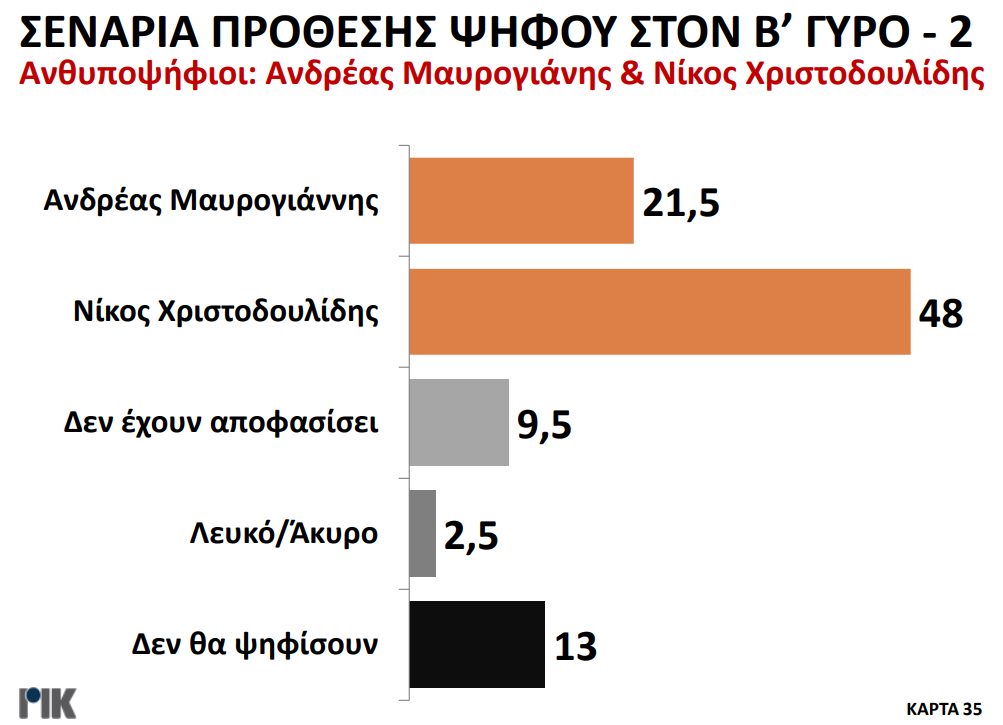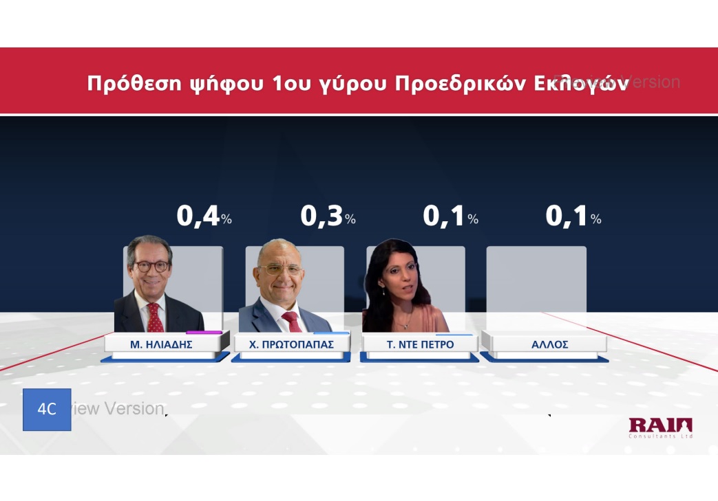 Παρουσιάστηκε το βράδυ της Πέμπτης 20 Οκτωβρίου η πρώτη δημοσκόπηση του ΡΙΚ για τις Προεδρικές Εκλογές. Μέσα από τα αποτελέσματα της δημοσκόπησης επιβεβαιώνεται η πρωτοπορία Νίκου Χριστοδουλίδη, με ένα ποσοστό της τάξεως του 30,5% στην πρόθεση ψήφου. Ακολουθούν Αβέρωφ Νεοφύτου και Ανδρέας Μαυρογιάννης με ποσοστά 19% και 17% αντίστοιχα. Ο τέως ΥΠΕΞ κερδίζει και στα δύο σενάρια του Β’ γύρου με αντίπαλο είτε τον πρόεδρο του ΔΗΣΥ είτε τον τέως διαπραγματευτή, ενώ στην περίπτωση που Αβέρωφ Νεοφύτου και Ανδρέας Μαυρογιάννης κόψουν πρώτοι το νήμα στον Α’ γύρο, αναμένεται μια σκληρή, κεφάλι με κεφάλι, μάχη.