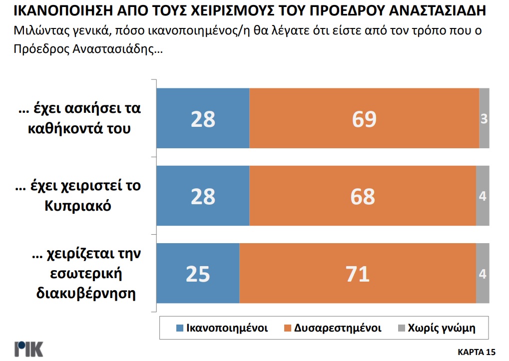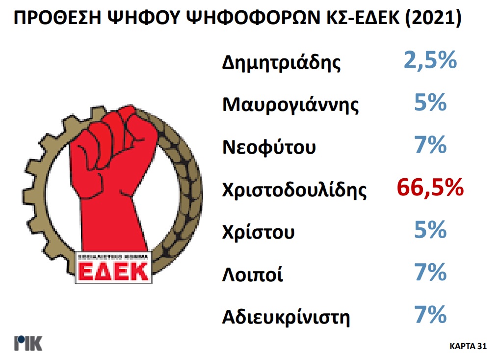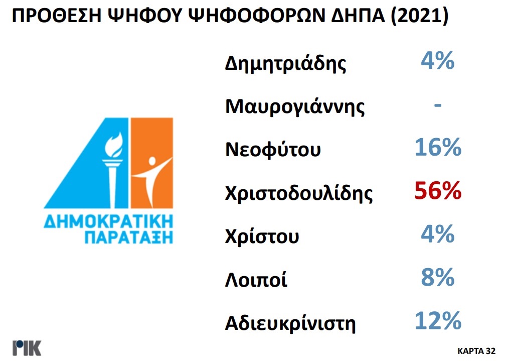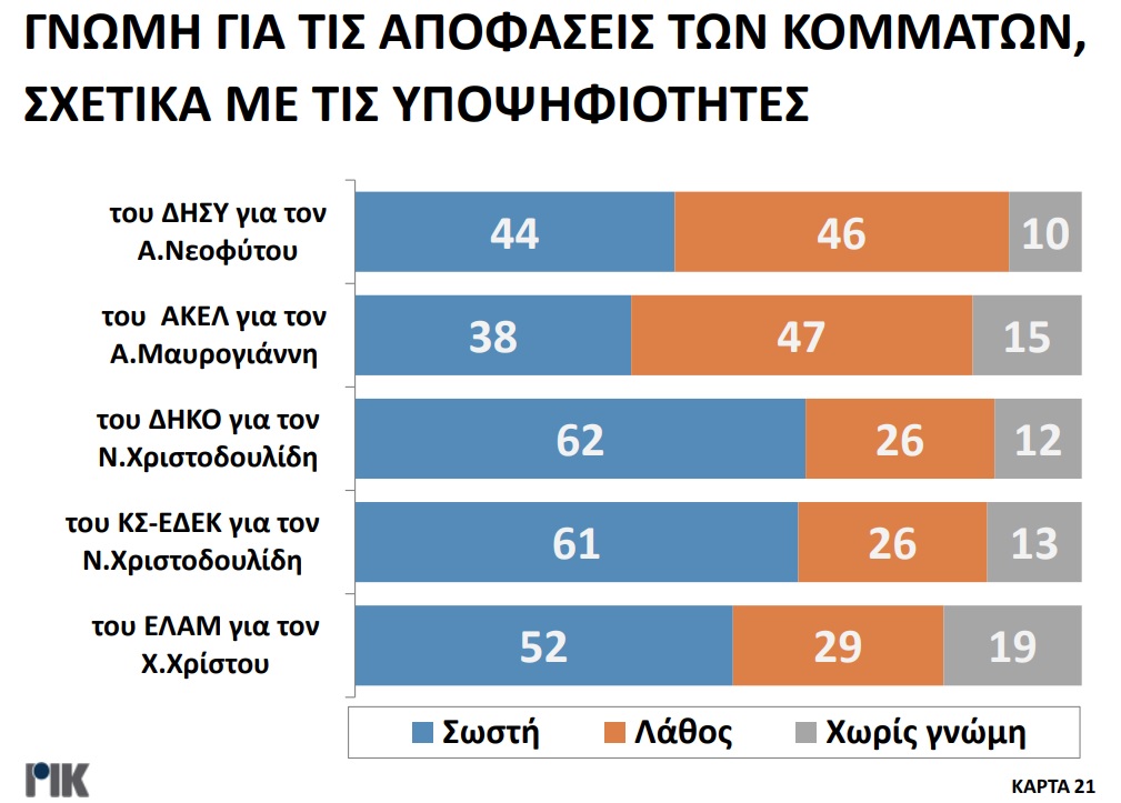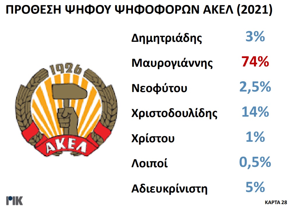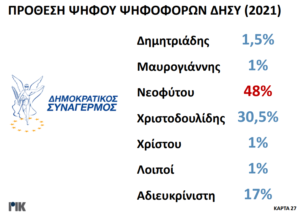 Παρουσιάστηκε το βράδυ της Πέμπτης 20 Οκτωβρίου η πρώτη δημοσκόπηση του ΡΙΚ για τις Προεδρικές Εκλογές. Μέσα από τα αποτελέσματα της δημοσκόπησης επιβεβαιώνεται η πρωτοπορία Νίκου Χριστοδουλίδη, με ένα ποσοστό της τάξεως του 30,5% στην πρόθεση ψήφου. Ακολουθούν Αβέρωφ Νεοφύτου και Ανδρέας Μαυρογιάννης με ποσοστά 19% και 17% αντίστοιχα. Ο τέως ΥΠΕΞ κερδίζει και στα δύο σενάρια του Β’ γύρου με αντίπαλο είτε τον πρόεδρο του ΔΗΣΥ είτε τον τέως διαπραγματευτή, ενώ στην περίπτωση που Αβέρωφ Νεοφύτου και Ανδρέας Μαυρογιάννης κόψουν πρώτοι το νήμα στον Α’ γύρο, αναμένεται μια σκληρή, κεφάλι με κεφάλι, μάχη.