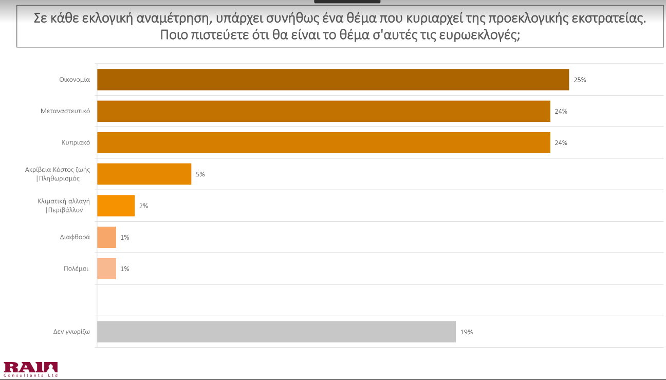 Η τριπλέτα οικονομία - μεταναστευτικό - Κυπριακό είναι αυτή που θεωρούν οι πολίτες πως θα κυριαρχήσει, σύμφωνα με τη δημοσκόπηση της RAI, αφού θεωρούν πως είναι τα θέματα που τους καίνε περισσότερο. Στην ερώτηση ποιο πιστεύετε πως θα είναι το θέμα που θα κυριαρχήσει σε αυτές τις εκλογές, το 25% θεωρεί πως θα είναι η οικονομία, ενώ άλλο ένα 24% απαντά το μεταναστευτικό, ενώ ψηλά στην ατζέντα θεωρούν οι πολίτες πως θα βρίσκεται και το Κυπριακό, αφού το 25% των ερωτηθέντων απαντά πως θα είναι από τα θέματα που θα συζητηθούν. Από τα υπόλοιπα θέματα που θα βρίσκονται στη δημόσια σφαίρα κατά τους πολίτες, είναι το κόστος ζωής, παρά το ότι ενδεχομένως να συνδυάζεται και να εντάσσεται σε αυτά της οικονομίας, ένα 2% θεωρεί πως θα συζητηθεί η κλιματική αλλαγή, ενώ χαμηλά στην ατζέντα βάζουν οι πολίτες τη διαφθορά και τον πόλεμο. Φυσικά, υπάρχει και ένα σημαντικό 19% των ερωτηθέντων που απαντά πως δεν γνωρίζει ποιο είναι το θέμα που θα κυριαρχήσει στην εκλογική περίοδο.