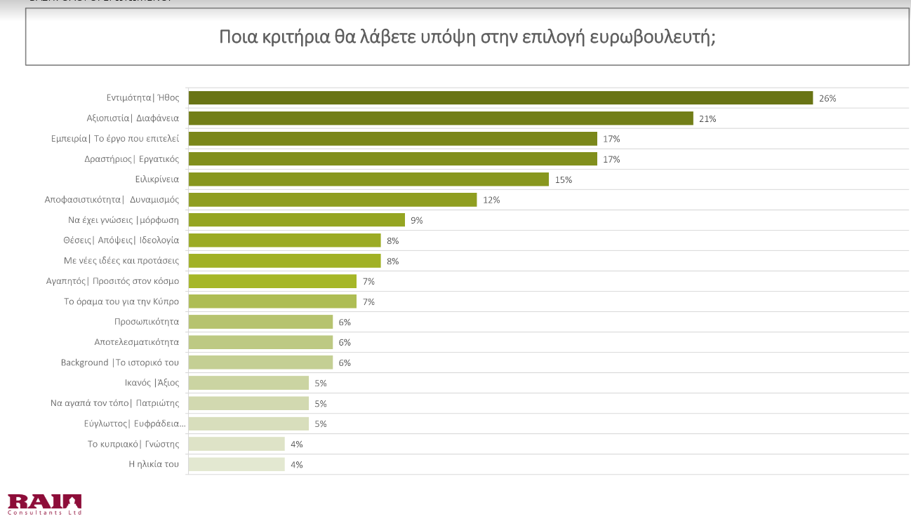 Οι πολίτες ενδιαφέρονται, σύμφωνα με τη δημοσκόπηση, ο ευρωβουλευτής που θα ψηφίσουν να είναι περισσότερο έντιμος και με ήθος, αξιόπιστος και δραστήριος, παρά να έχει καθαρές θέσεις για θέσεις πολιτικής. Στο ερώτημα «Ποια κριτήρια θα λάβετε υπόψη σας στην επιλογή ευρωβουλευτή», οι πολίτες βάζουν σε προτεραιότητα τα ποιοτικά χαρακτηριστικά ενός ευρωβουλευτή, παρά να είναι γνώστης για το Κυπριακό. Έτσι, στα κριτήρια που βάζουν οι πολίτες, ο υποψήφιος ευρωβουλευτής που θα τεθεί ενώπιόν τους, θα πρέπει να είναι έντιμος (26%), αξιόπιστος (21%), να είναι υπέρ της διαφάνειας, να είναι ειλικρινής (15%), ενώ θα πρέπει να μην είναι ουρανοκατέβατος, αλλά να έχει εμπειρία και να ξέρουν το έργο που επιτελεί (17%). Κατά τα λοιπά, χαμηλά στα κριτήρια που βάζουν οι πολίτες είναι η ηλικία του, το κατά πόσον είναι εύγλωττος ή αν αγαπά τον τόπο του και αν είναι ικανός. Σημαντικό ρόλο όμως φαίνεται πως θα παίξουν, χωρίς να είναι σε άμεση προτεραιότητα, το πόσο αγαπητός, προσιτός είναι στον κόσμο, οι γνώσεις και η μόρφωσή του, η ιδεολογία του και το όραμά του για την Κύπρο.