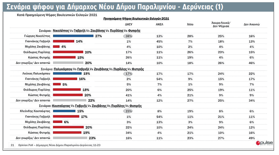Στον ΔΗΣΥ βλέποντας πολλούς… δελφίνους να έχουν εκφράσει την πρόθεση να διεκδικήσουν τη δημαρχία έβαλαν κάτω όλα τα πιθανά σενάρια εξετάζοντάς τους απέναντι στους διαφαινόμενους υποψηφίους και φαίνεται πως ο Νικολέττος είναι αυτός που μπορεί να κερδίσει τους αντιπάλους του. Στο σενάριο που διεκδικήσουν τη δημαρχία οι Γιώργος Νικολέττος, Γιαννάκη Γαβριήλ, Μιχάλης Ζουβάνης, Θεόδωρος Πυρίλλης και Κώστας Φυτιρής, ο Νικολέττος είναι πρώτη επιλογή με 38%, με τον νυν δήμαρχο Πυρίλλη να έχει μόλις 20%, ο Φυτιρής είναι στο 15%, ο Γιαννάκης Γαβριήλ στο 14%, ενώ ο Ζουβάνης έχει μόλις ένα 4%, ενώ αξίζει να σημειωθεί πως υπάρχει αδιευκρίνιστη ψήφος που φτάνει το 20%. Αν ο ΔΗΣΥ επιλέξει τον Λουκά Πολυκάρπου, τότε φαίνεται πως θα δοθεί μια σκληρή μάχη για να κερδίσει τον δήμο ο Συναγερμός, καθώς τρία πρόσωπα είναι κοντά στο 20% και έχοντας διαφορά μεταξύ τους στα όρια του στατιστικού λάθους, καθώς ο Φυτιρής είναι πρώτος με 20%, ο Πολυκάρπου στο 19%, ο Πυρίλλης στο 18%, ο Γιαννάκης Γαβριήλ στο 16% και ο Μιχάλης Ζουβάνης στο 5%. Στο σενάριο που ο ΔΗΣΥ επιλέξει να χρίσει υποψήφιο δήμαρχο τον Κλεάνθη Κουτσόφτα του ΟΝΕΚ, τότε σύμφωνα με τη δημοσκόπηση ο δήμος θα περάσει στα χέρια του Πυρίλλη με 20%, ο Φυτιρής θα δώσει σκληρή μάχη έχοντας 19%, ο Γιαννάκης Γαβριήλ θα είναι στο 17%, ενώ ο Κουτσόφτας έχει μόλις ένα 15% κερδίζοντας μόνο τον Ζουβάνη που πιάνει 6%.