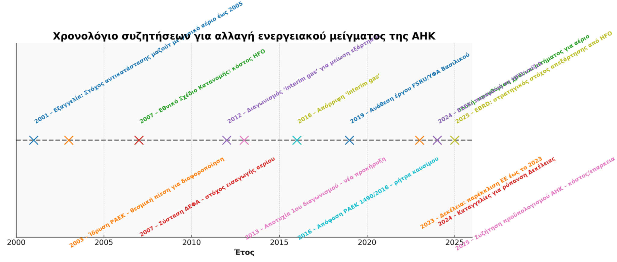 Δύο χρόνια αργότερα, το 2003, η ίδρυση της Ρυθμιστικής Αρχής Ενέργειας (ΡΑΕΚ, 2003) τοποθέτησε το ζήτημα στον θεσμικό χάρτη, σκοπεύοντας στην εναρμόνιση τη χώρας με την ευρωπαϊκή πολιτική απελευθέρωσης της αγοράς και διαφοροποίησης καυσίμων.