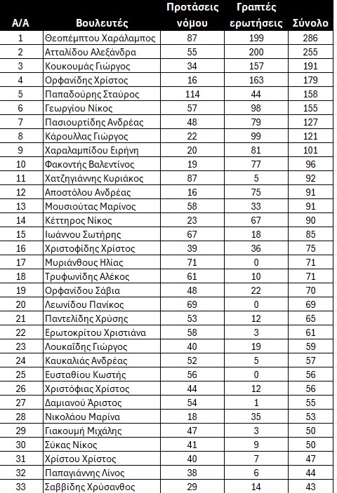 Οι βουλευτές Χαράλαμπος Θεοπέμπτου, Αλεξάνδρα Ατταλίδου, Κουκουμάς Γιώργος, Χρίστος Ορφανίδης και Σταύρος Παπαδούρης βρίσκονται στην πεντάδα των πιο ενεργών μελών της Βουλής των Αντιπροσώπων, σύμφωνα με τα ποσοτικά δεδομένα που συγκέντρωσε η μη κυβερνητική οργάνωση Oxygen for Democracy, τα οποία βασίζονται στον συνολικό αριθμό προτάσεων νόμου που έχει καταθέσει ο κάθε βουλευτής και των γραπτών ερωτήσεων που υπέβαλε προς τα αρμόδια υπουργεία, από την έναρξη της τρέχουσας κοινοβουλευτικής περιόδου μέχρι και την τελευταία ολομέλεια στις 10 Ιουλίου. Στην πεντάδα των λιγότερο ενεργών βουλευτών βρίσκονται οι Άντρος Κυπριανού, Μάριος Κάρογιαν, Παπαδόπουλος Νικόλας, Στέφανος Στεφάνου και Αννίτα Δημητρίου. Ωστόσο δεν είναι ο τελικός Δείκτης Αξιολόγησης Βουλευτών ο οποίος θα λαμβάνει υπόψη και άλλα δεδομένα, όπως είναι για παράδειγμα οι προεδρίες των κοινοβουλευτικών επιτροπών, τα καθήκοντα των αρχηγών κομμάτων και των κοινοβουλευτικών εκπροσώπων και οι αποστολές στο εξωτερικό.
