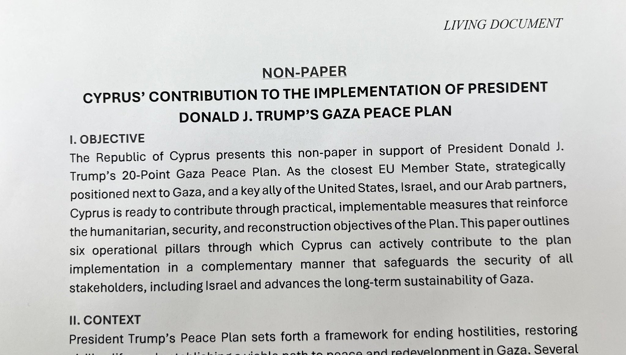 «Η Κυπριακή Δημοκρατία παρουσιάζει αυτό το ανεπίσημο έγγραφο προς υποστήριξη του 20 σημείων ειρηνευτικού σχεδίου του Προέδρου Ντόναλντ ΤΖ. Τραμπ για τη Γάζα. Ως το πλησιέστερο κράτος μέλος της ΕΕ, στρατηγικά τοποθετημένο δίπλα στη Γάζα και βασικός σύμμαχος των Ηνωμένων Πολιτειών, του Ισραήλ και των Αράβων εταίρων μας, η Κύπρος είναι έτοιμη να συμβάλει μέσω πρακτικών, εφαρμόσιμων μέτρων που ενισχύουν τους ανθρωπιστικούς στόχους, τους στόχους ασφάλειας και ανοικοδόμησης του Σχεδίου. Το παρόν έγγραφο περιγράφει έξι επιχειρησιακούς πυλώνες μέσω των οποίων η Κύπρος μπορεί να συμβάλει ενεργά στην εφαρμογή του σχεδίου με συμπληρωματικό τρόπο που διασφαλίζει την ασφάλεια όλων των ενδιαφερόμενων μερών, συμπεριλαμβανομένου του Ισραήλ, και προωθεί τη μακροπρόθεσμη βιωσιμότητα της Γάζας.