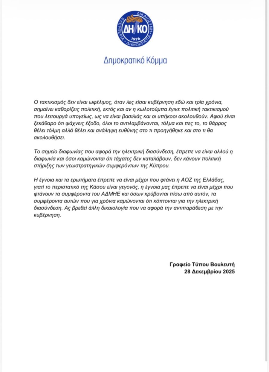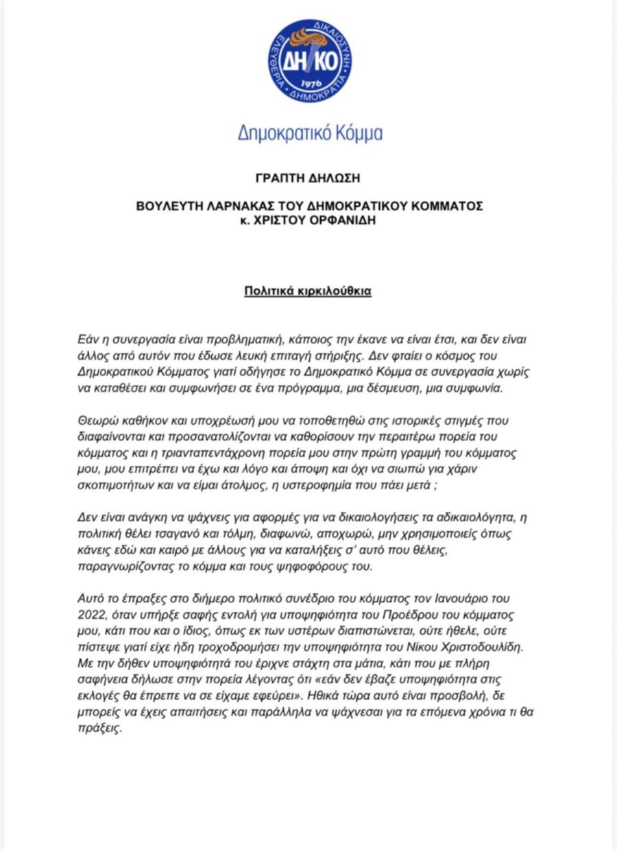 Στη γραπτή του δήλωση, ο κ. Ορφανίδης υποστηρίζει ότι τα προβλήματα στη συνεργασία του ΔΗΚΟ με την κυβέρνηση δεν είναι συγκυριακά, αλλά αποτέλεσμα συγκεκριμένων επιλογών, σημειώνοντας πως «αν η συνεργασία είναι προβληματική, κάποιος την έκανε να είναι έτσι». Παράλληλα, τονίζει ότι το κόμμα οδηγήθηκε σε συγκυβέρνηση χωρίς να έχει προηγηθεί ουσιαστική συμφωνία επί πολιτικών στόχων και προτεραιοτήτων.