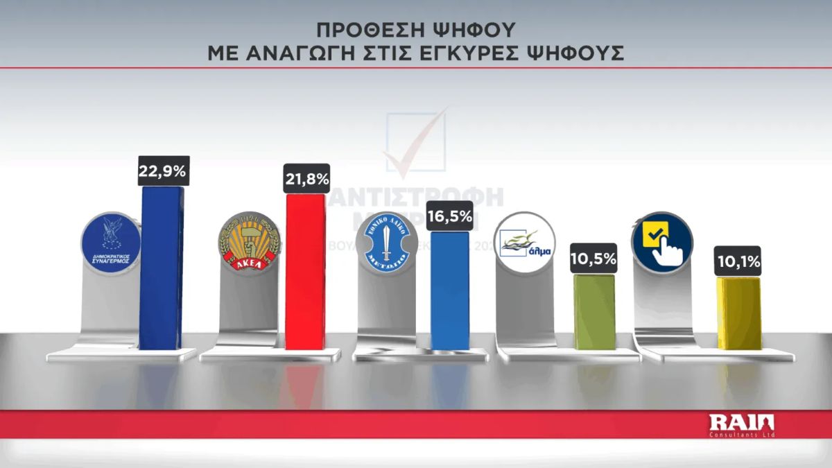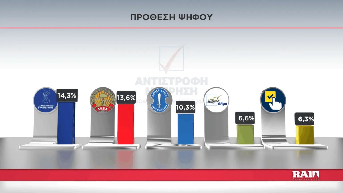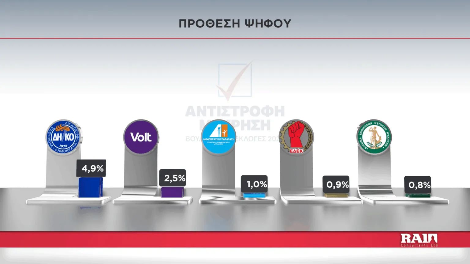 Η πρόθεση ψήφου φέρνει πρώτο τον ΔΗΣΥ, με μικρό προβάδισμα από το ΑΚΕΛ, ενώ τρίτο κόμμα αναδεικνύεται το ΕΛΑΜ. Είσοδο στη Βουλή φαίνεται να εξασφαλίζουν το Κίνημα «Άλμα» και η «Άμεση Δημοκρατία».