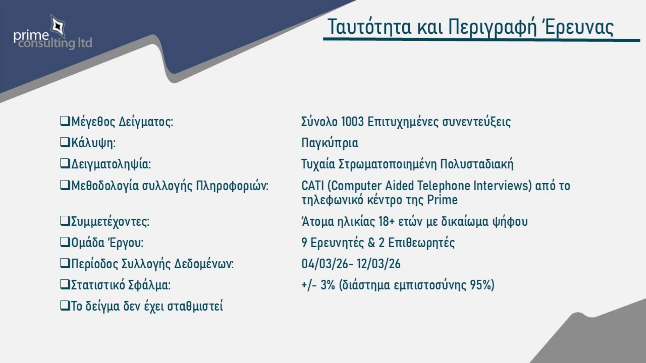 Η έρευνα πραγματοποιήθηκε παγκύπρια με δείγμα 1003 ατόμων και περιθώριο στατιστικού σφάλματος ±3%.