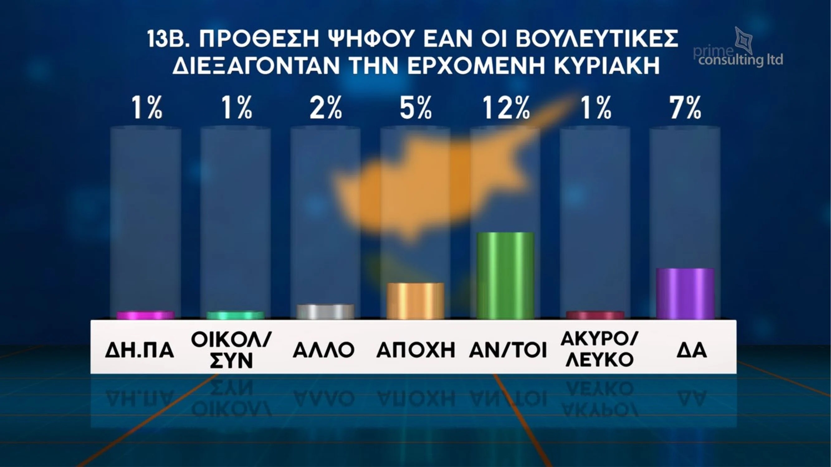 Στην ερώτηση εάν οι βουλευτικές εκλογές διεξάγονταν την ερχόμενη Κυριακή, το ΕΛΑΜ λαμβάνει 11%, το ΑΛΜΑ αγγίζει το 9%, το ΔΗΚΟ φτάνει στο 7% και η Άμεση Δημοκρατία στο 5%. Ακολουθεί το Volt με 3% και η ΕΔΕΚ με 2%.