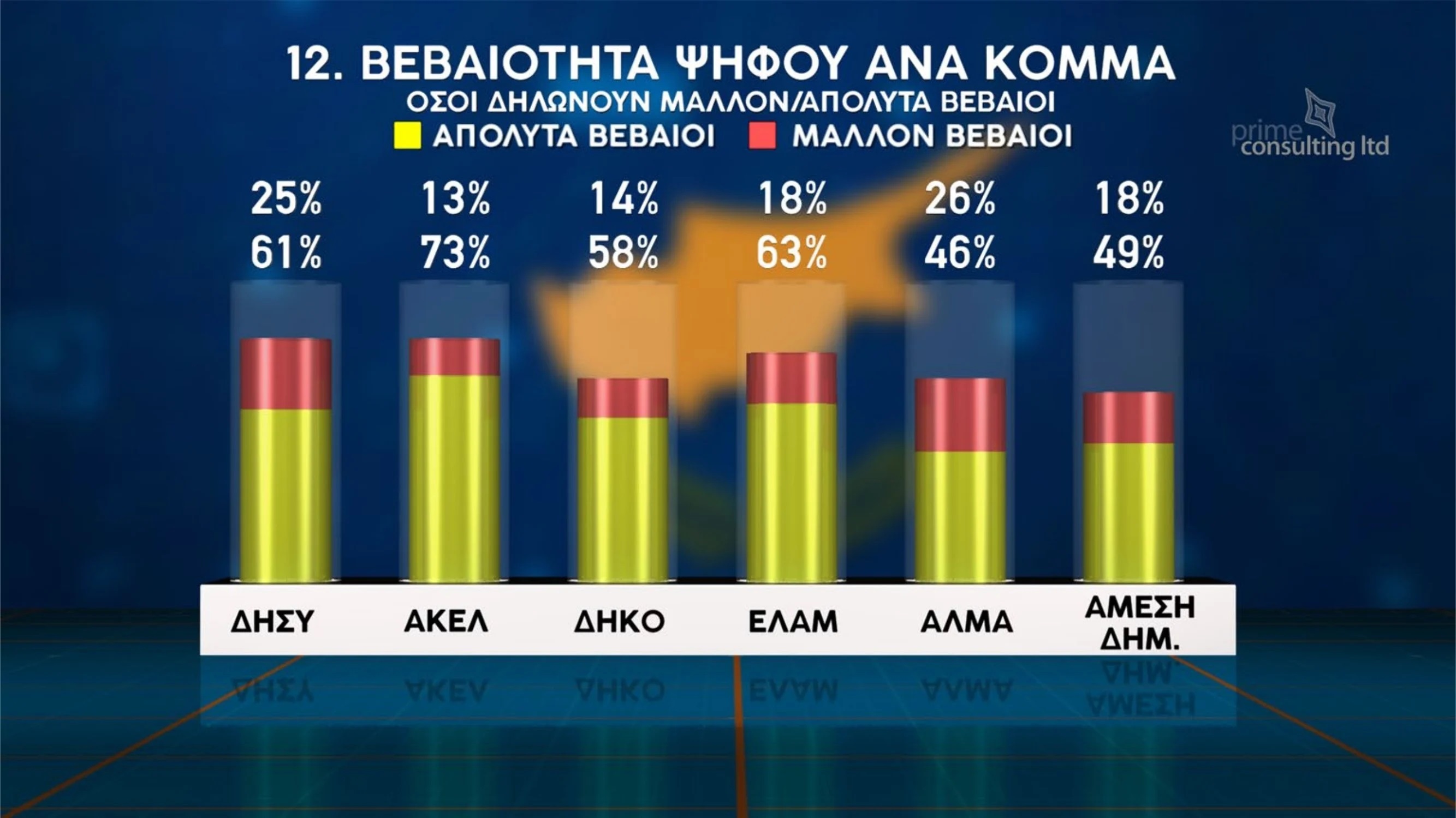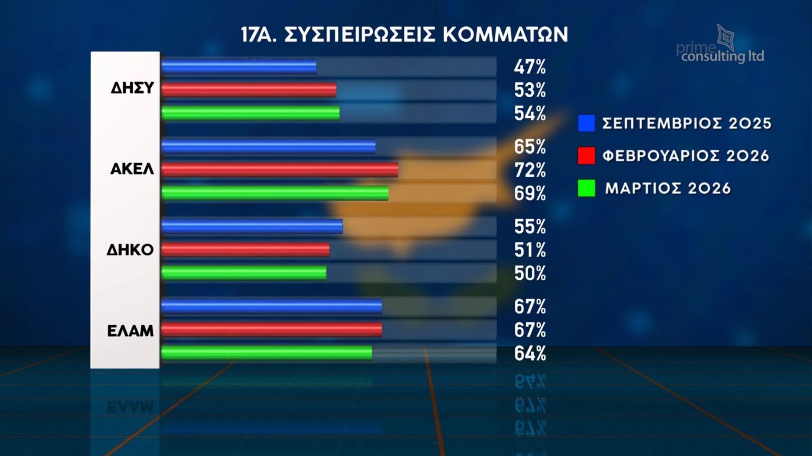 Τη μεγαλύτερη συσπείρωση καταγράφει το ΑΚΕΛ με 69%, ακολουθεί το ΕΛΑΜ με 64%, ο ΔΗΣΥ με 54%, το ΔΗΚΟ με 50%, η ΕΔΕΚ με 47%, η ΔΗΠΑ με 25% και το Κίνημα Οικολόγων – Συνεργασία Πολιτών με 15%.