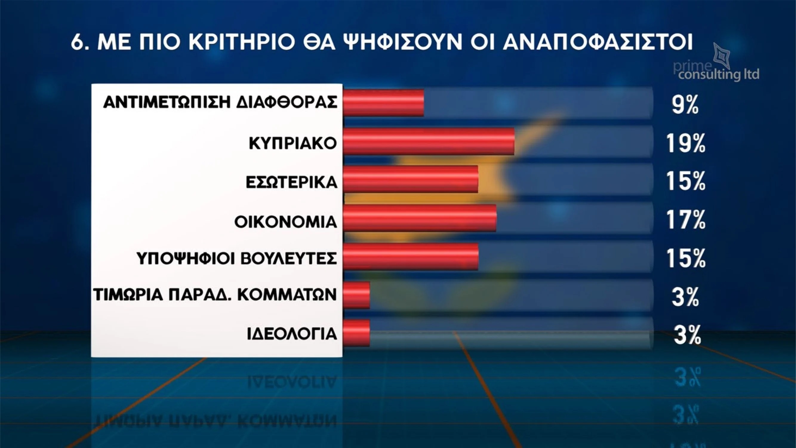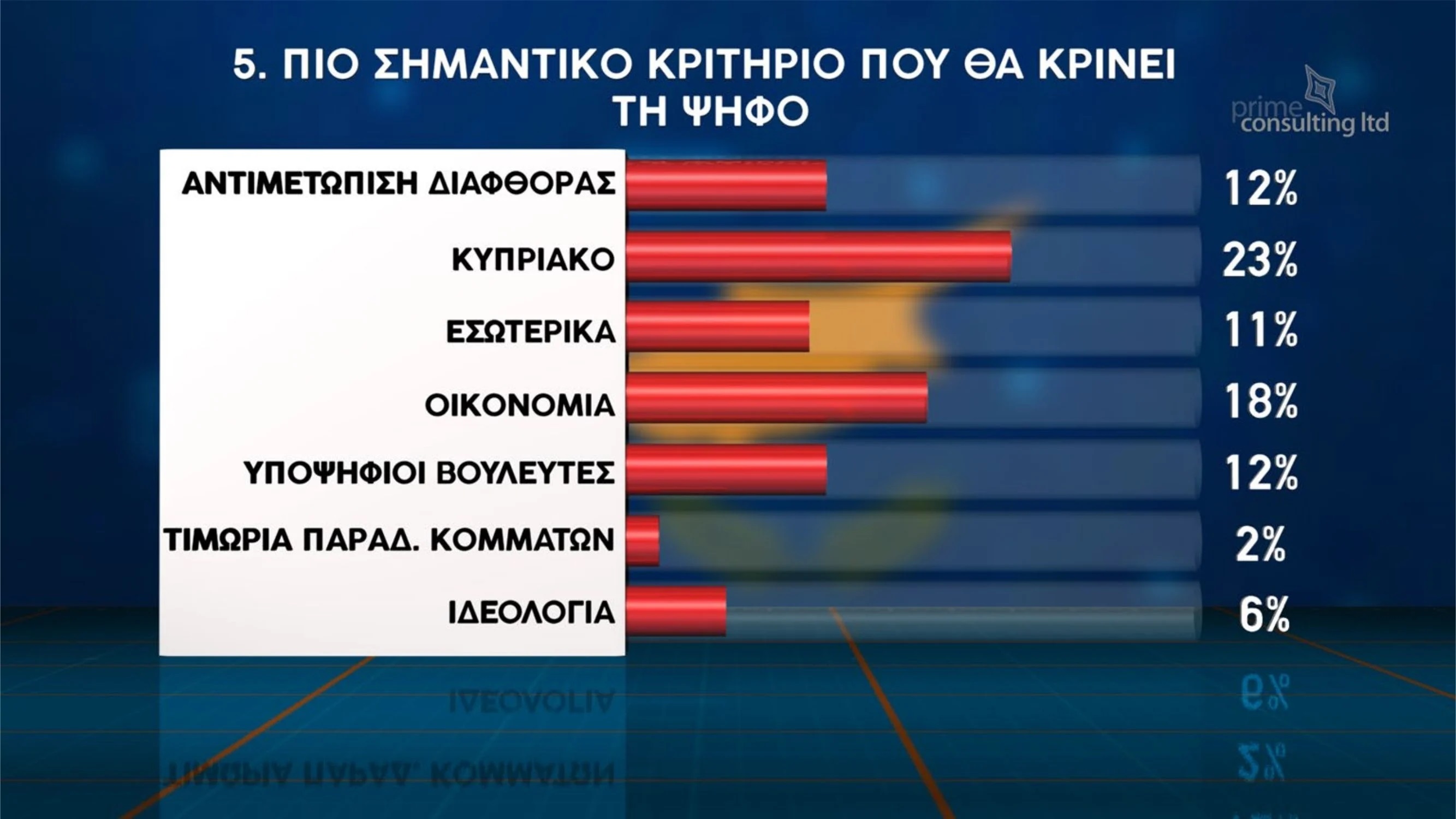 Το Κυπριακό αναδεικνύεται ως το σημαντικότερο κριτήριο με το οποίο θα ψηφίσουν οι συμμετέχοντες με ποσοστό 23%. Ακολουθεί η οικονομία με 18%, η αντιμετώπιση της διαφθοράς με 12% και τα εσωτερικά ζητήματα με 11%.