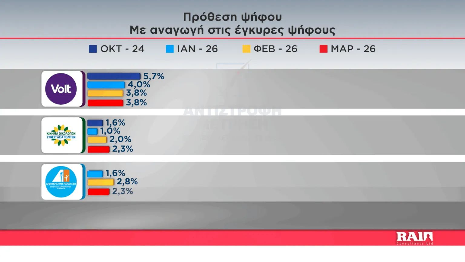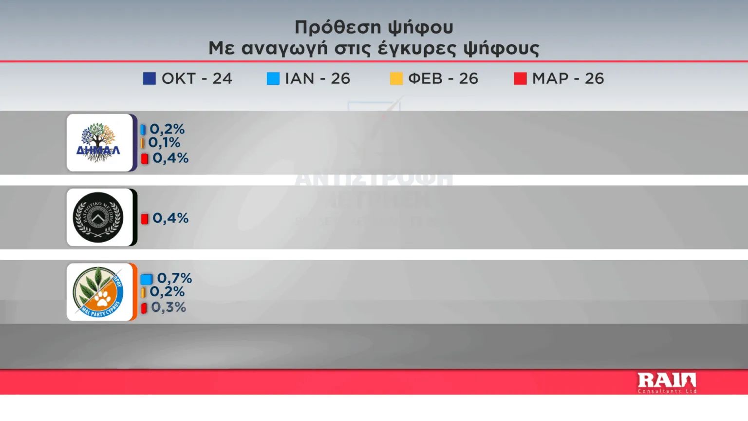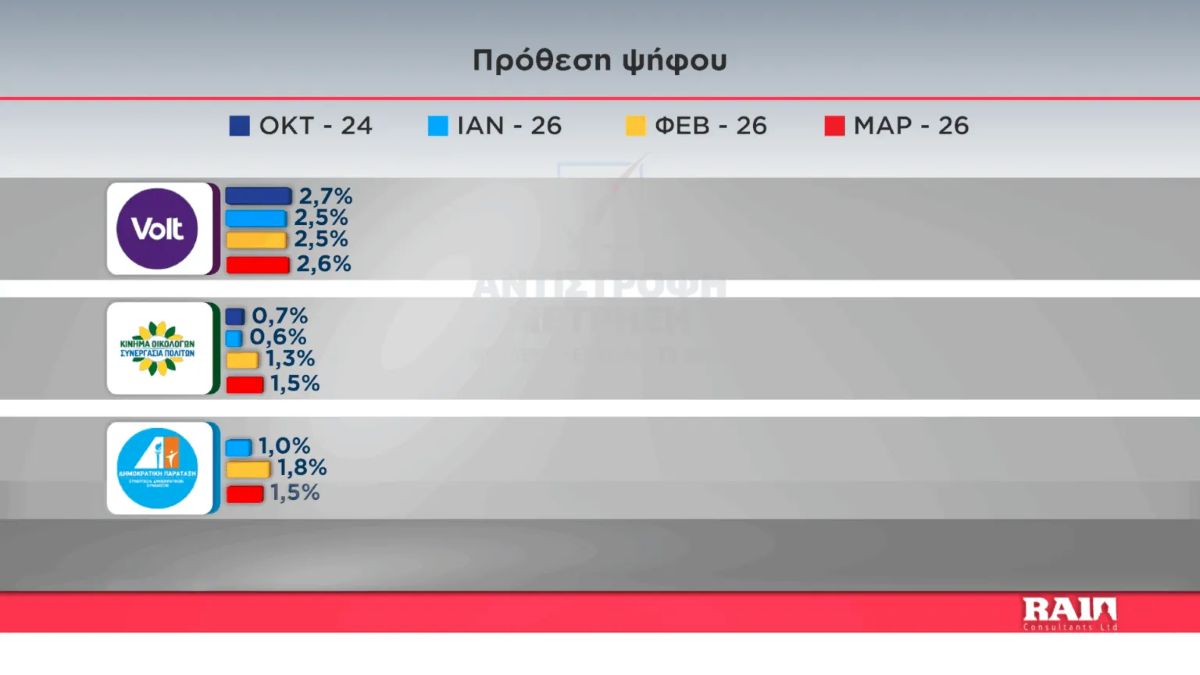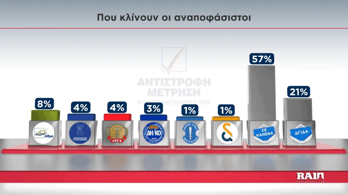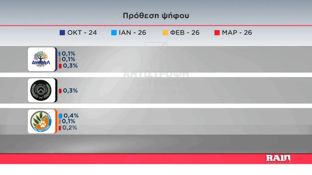 Ανοδικά κινούνται σε σύγκριση με τον προηγούμενο μήνα το «Άλμα» του Οδυσσέα Μιχαηλίδη με 7,4% και η «Άμεση Δημοκρατία Κύπρου» του Φειδία Παναγιώτου με 6,8%. Το Δημοκρατικό Κόμμα υποχωρεί στην έκτη θέση με 5,4%, ενώ το VOLT καταγράφει 2,6%. Οι Οικολόγοι και η ΔΗΠΑ συγκεντρώνουν από 1,5%, η ΕΔΕΚ 1,4%, η ΔΕΚ 0,5% και οι Κυνηγοί 0,4%. Την ίδια στιγμή, ξεχωρίζει το υψηλό ποσοστό των αναποφάσιστων που αγγίζει το 25,1%.