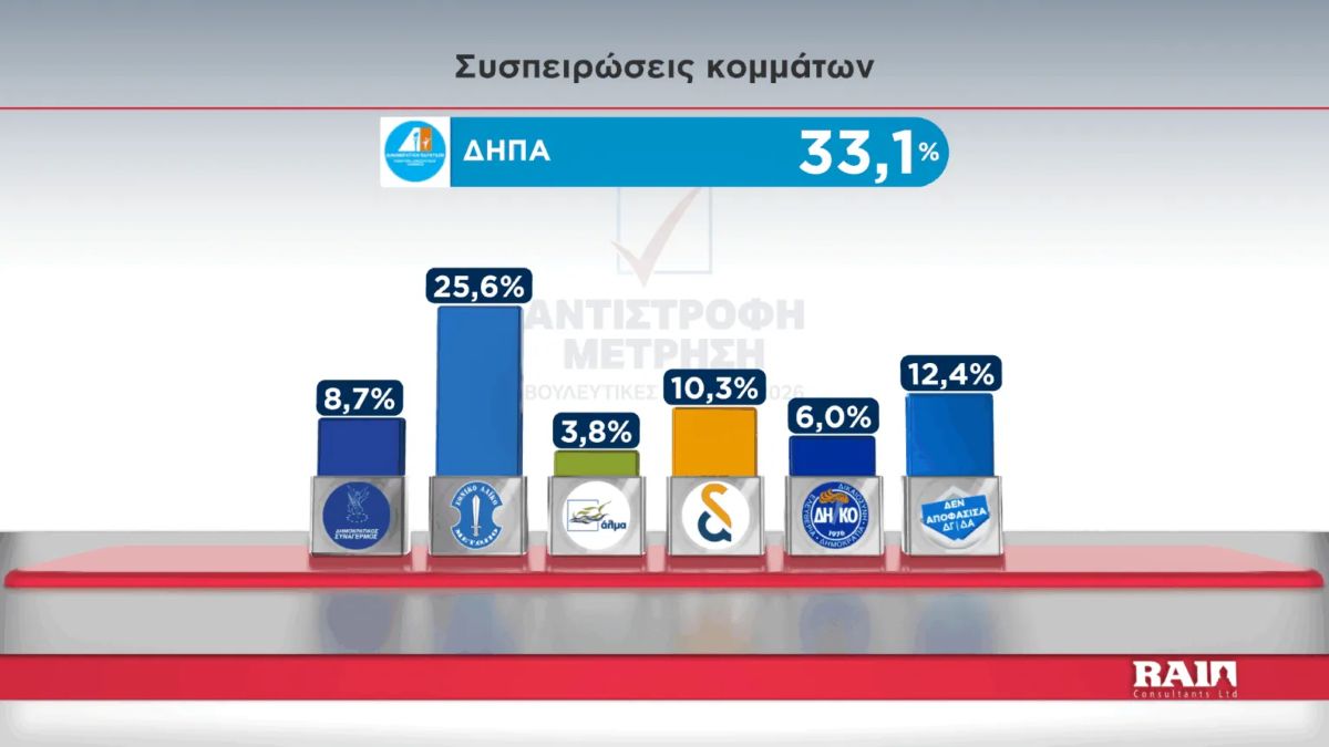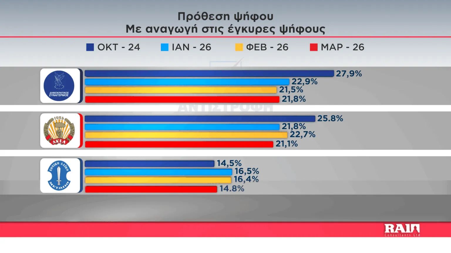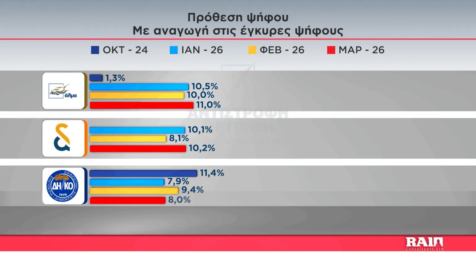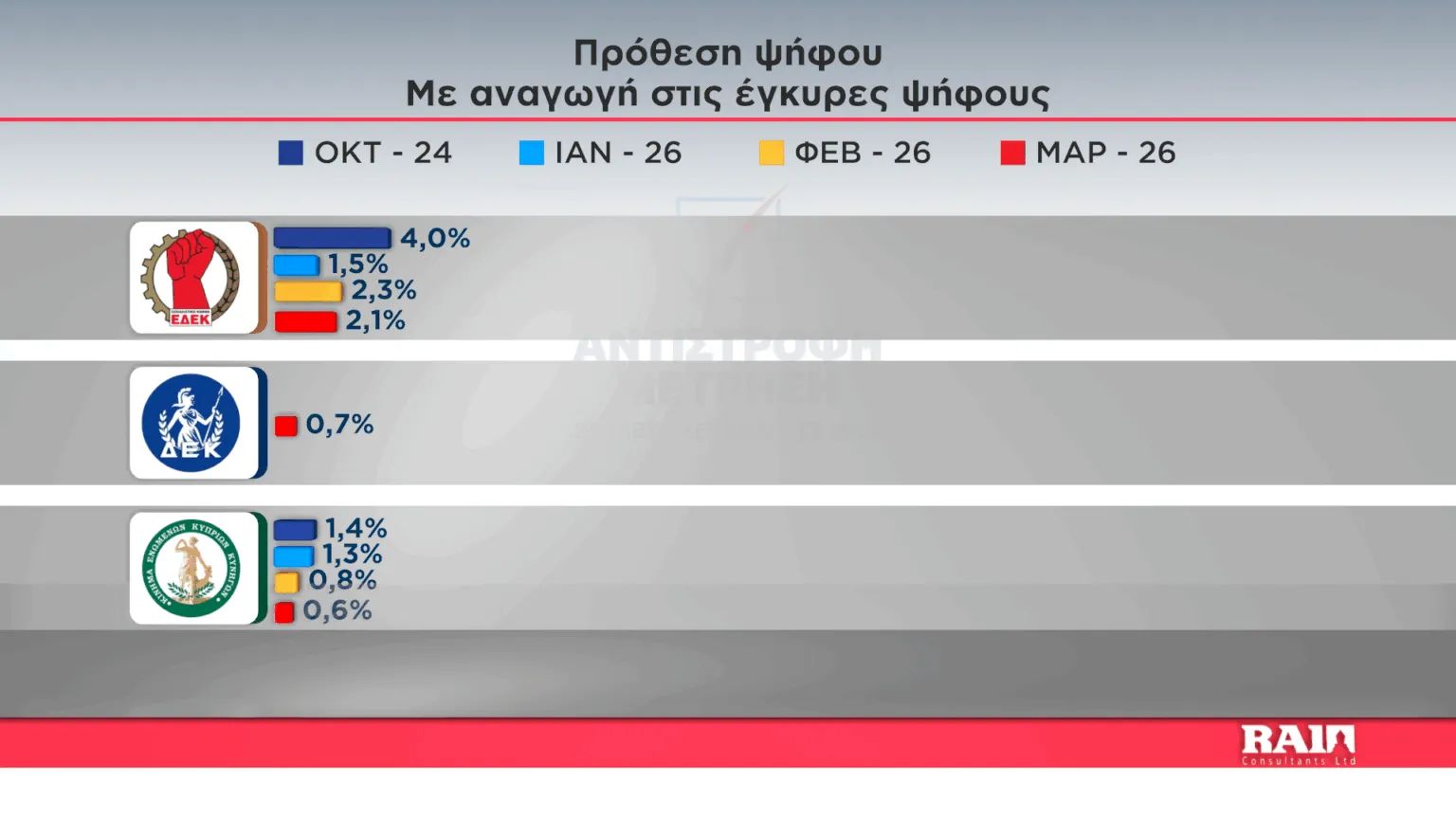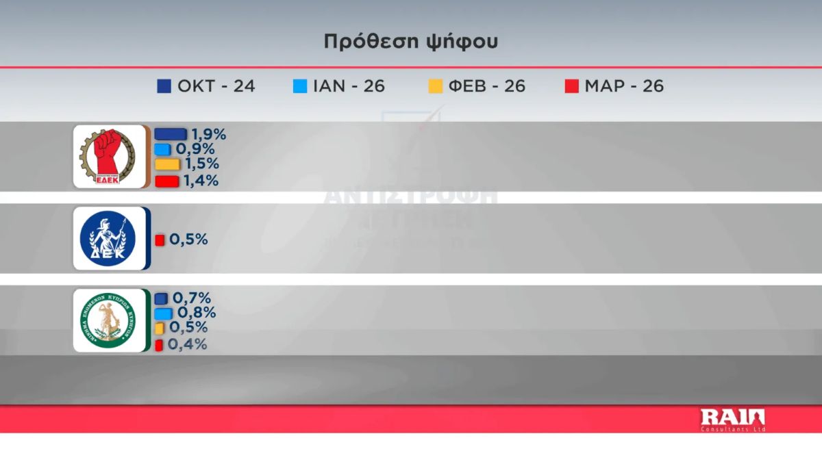 Με οριακή διαφορά 0,4%, ο Δημοκρατικός Συναγερμός φαίνεται να προηγείται στην εκλογική κούρσα ενόψει των Βουλευτικών Εκλογών, αφήνοντας το ΑΚΕΛ στη δεύτερη θέση. Αυτό προκύπτει από την τρίτη κατά σειρά δημοσκόπηση της Rai Consultants, την οποία παρουσίασε χθές βράδυ ο Άλφα Κύπρου, όπου τα δύο μεγάλα κόμματα συγκεντρώνουν 14,6% και 14,2% αντίστοιχα στην πρόθεση ψήφου. Το ΕΛΑΜ διατηρεί την τρίτη θέση με 9,9%, παρά μια μικρή υποχώρηση σε σχέση με τον Φεβρουάριο.