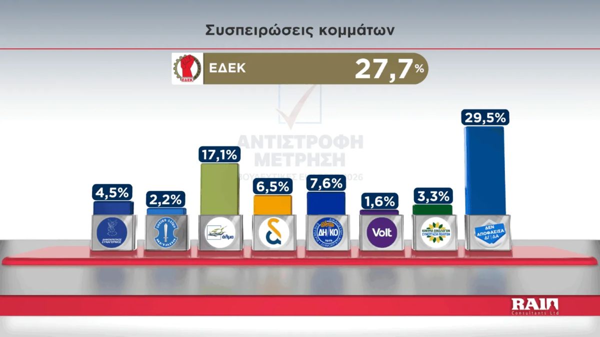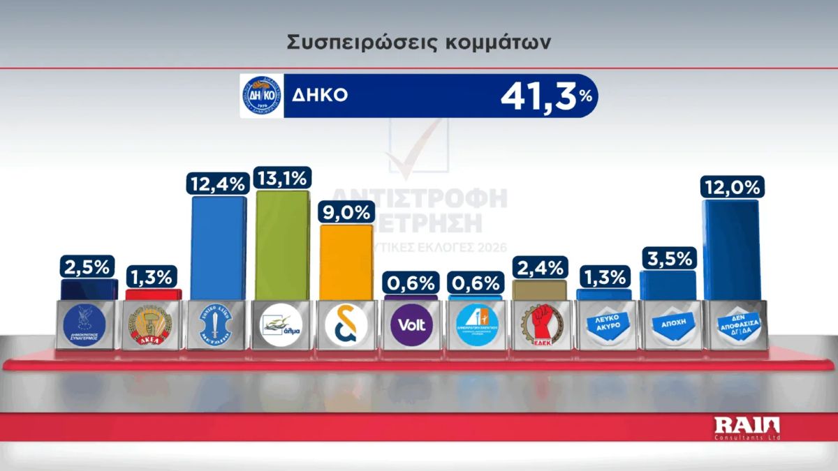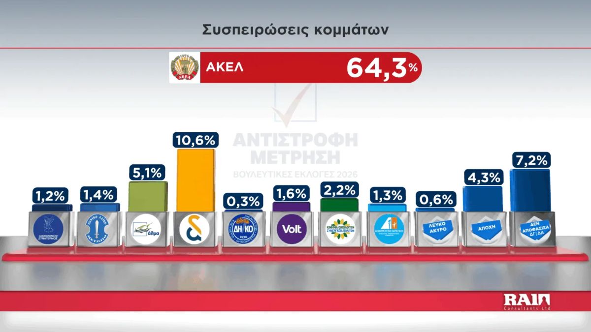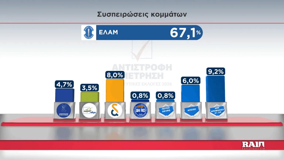 Σε ό,τι αφορά τα ποσοστά συσπείρωσης των κομμάτων, δύο μήνες πριν από τις εκλογές, στην πρώτη θέση βρίσκεται το ΕΛΑΜ με 67,1%. Ακολουθούν το ΑΚΕΛ με 64,3% και ο ΔΗΣΥ με 52,2%, ενώ χαμηλότερα καταγράφονται το ΔΗΚΟ με 41,3%, η ΔΗΠΑ με 33,1%, η ΕΔΕΚ με 27,7% και οι Οικολόγοι με 24,2%.