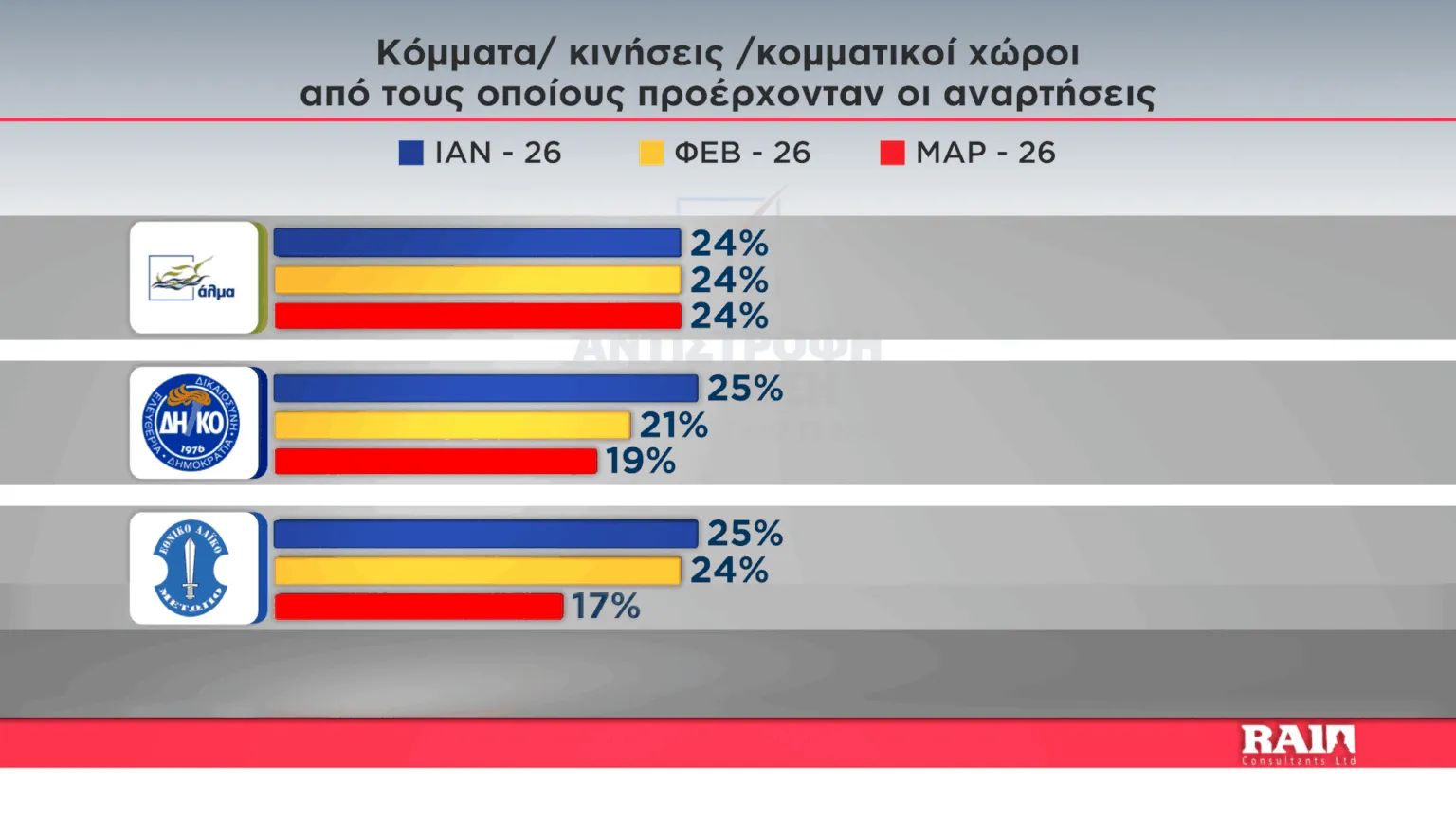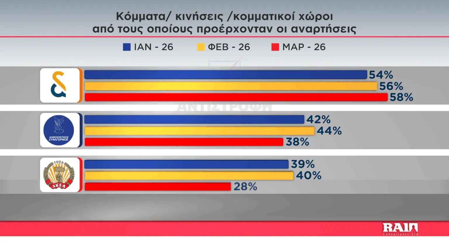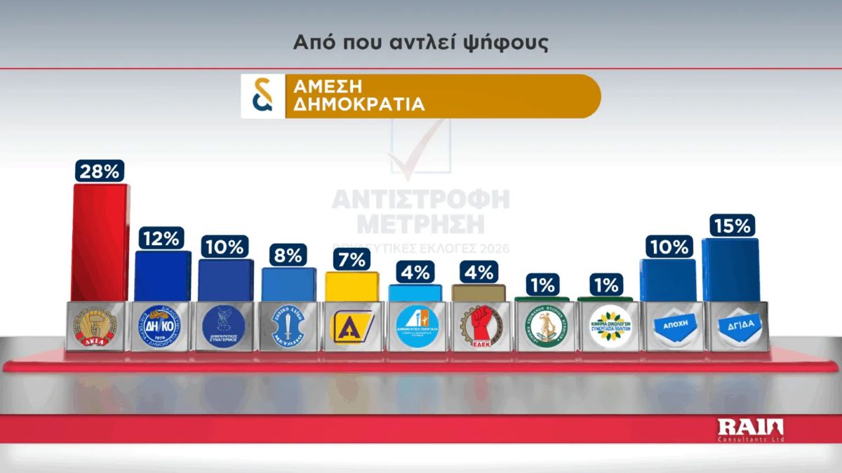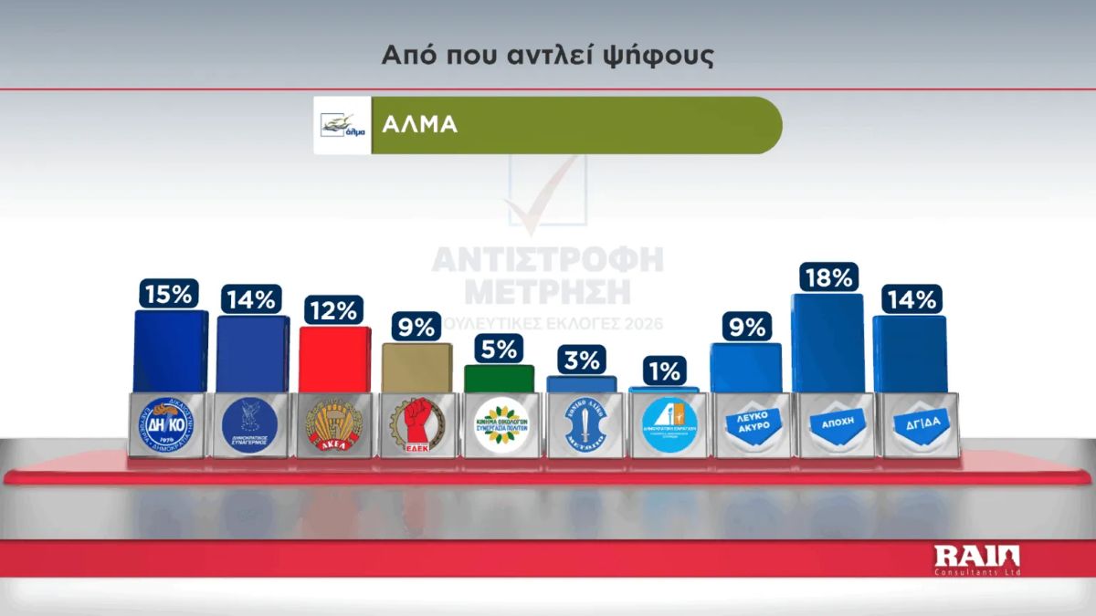 Τα στοιχεία δείχνουν μετακινήσεις ψηφοφόρων, με το ΑΛΜΑ να προσελκύει το 15% των ψηφοφόρων του ΔΗΚΟ και την Άμεση Δημοκρατία το 28% των ψηφοφόρων του ΑΚΕΛ.