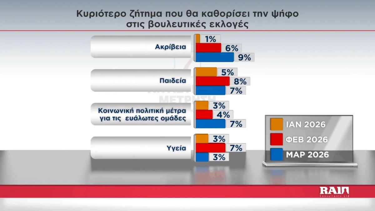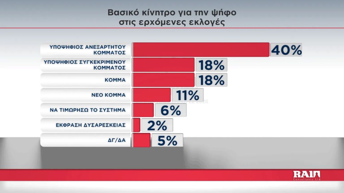 Ως προς τα κριτήρια ψήφου, το 40% των ερωτηθέντων δηλώνει ότι βασικό ρόλο παίζει ο υποψήφιος και όχι το κόμμα. Σε ό,τι αφορά τα ζητήματα που θα επηρεάσουν την ψήφο, η οικονομία καταγράφεται πρώτη με 32%, ακολουθεί το Κυπριακό με 24% και η διαφθορά με 13%.
