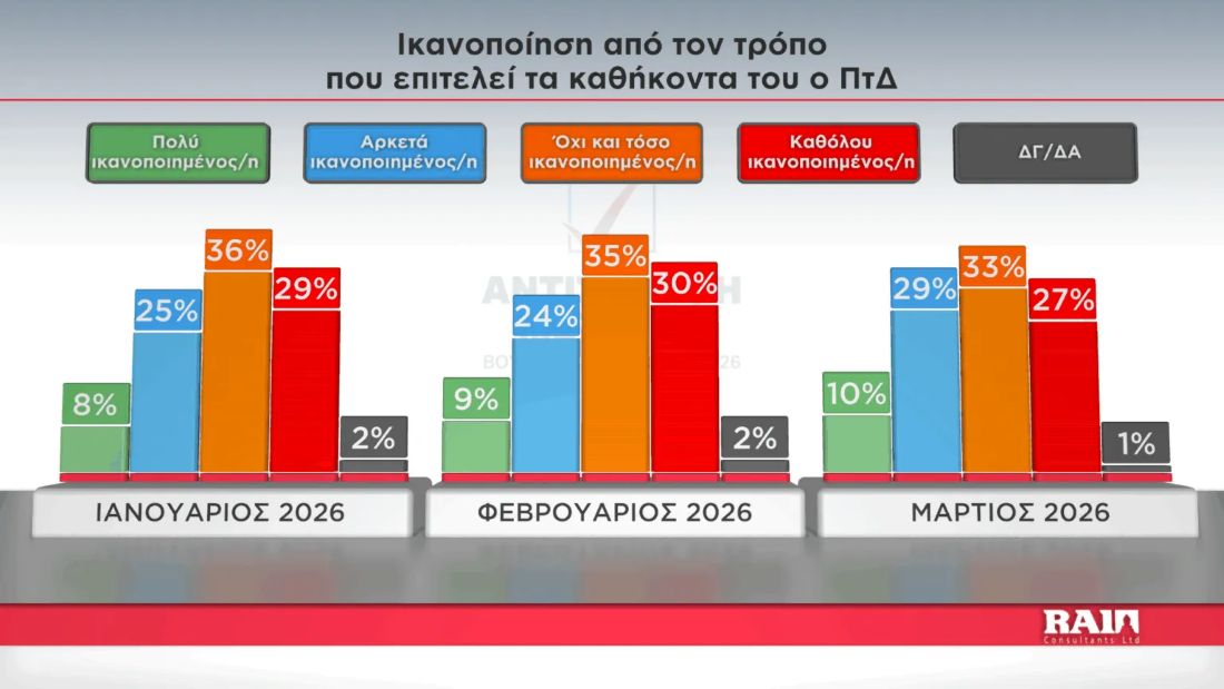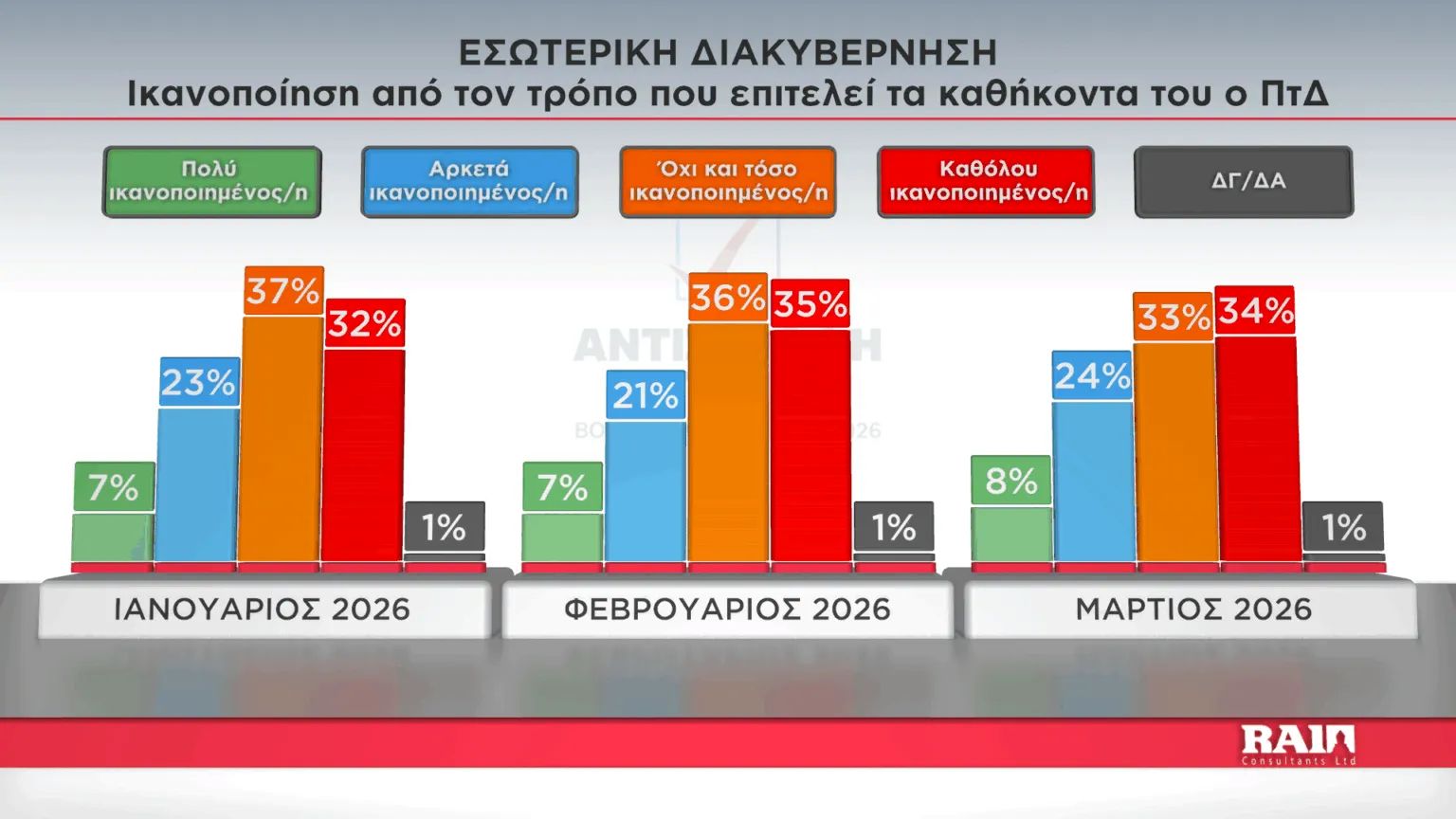 Θετικά αποτιμώνται και οι χειρισμοί της κυβέρνησης σε σχέση με τη διαχείριση της κρίσης που συνδέεται με τις εξελίξεις στο Ιράν και ευρύτερα στη Μέση Ανατολή. Το 54% δηλώνει ικανοποιημένο από τη διαχείριση, ενώ το 42% εκφράζει δυσαρέσκεια.