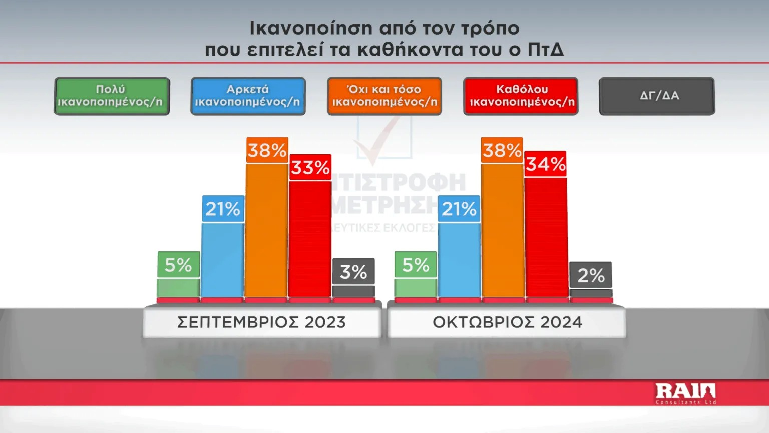Ωστόσο, η εμπιστοσύνη προς τα κόμματα παραμένει χαμηλή, αφού μόλις το 17% δηλώνει ικανοποιημένο, ενώ το 84% εκφράζει δυσαρέσκεια.