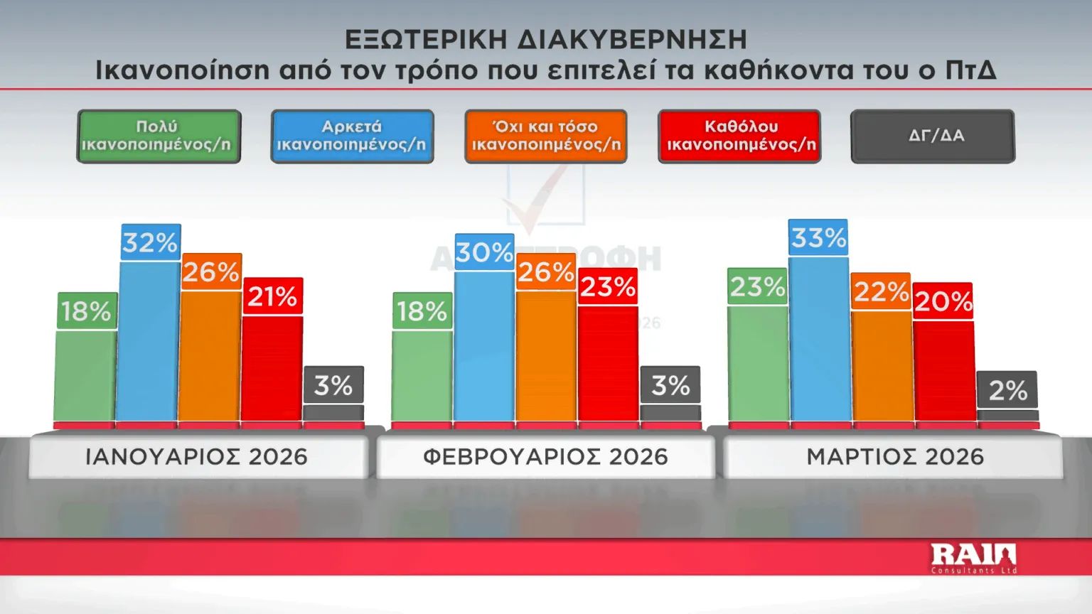 Σε ό,τι αφορά την εσωτερική διακυβέρνηση, το 32% εκφράζει ικανοποίηση έναντι 67% που δηλώνει δυσαρεστημένο. Αντίθετα, στην εξωτερική πολιτική οι αξιολογήσεις είναι πιο θετικές, με το 56% να δηλώνει ικανοποιημένο και το 42% μη ικανοποιημένο.