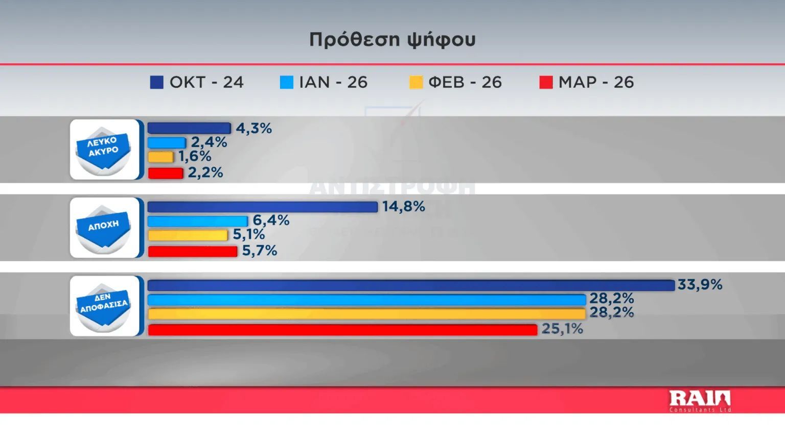 Παράλληλα, καταγράφεται αυξημένο ενδιαφέρον συμμετοχής, με το 79% να δηλώνει ότι σίγουρα θα ψηφίσει και ένα επιπλέον 11% ότι πιθανότατα θα προσέλθει στις κάλπες. Σε σχέση με τις Βουλευτικές του 2021, το 36% δηλώνει ικανοποιημένο από την επιλογή του και προτίθεται να την επαναλάβει, ενώ το 32% εμφανίζεται δυσαρεστημένο και σκοπεύει να αλλάξει ψήφο.