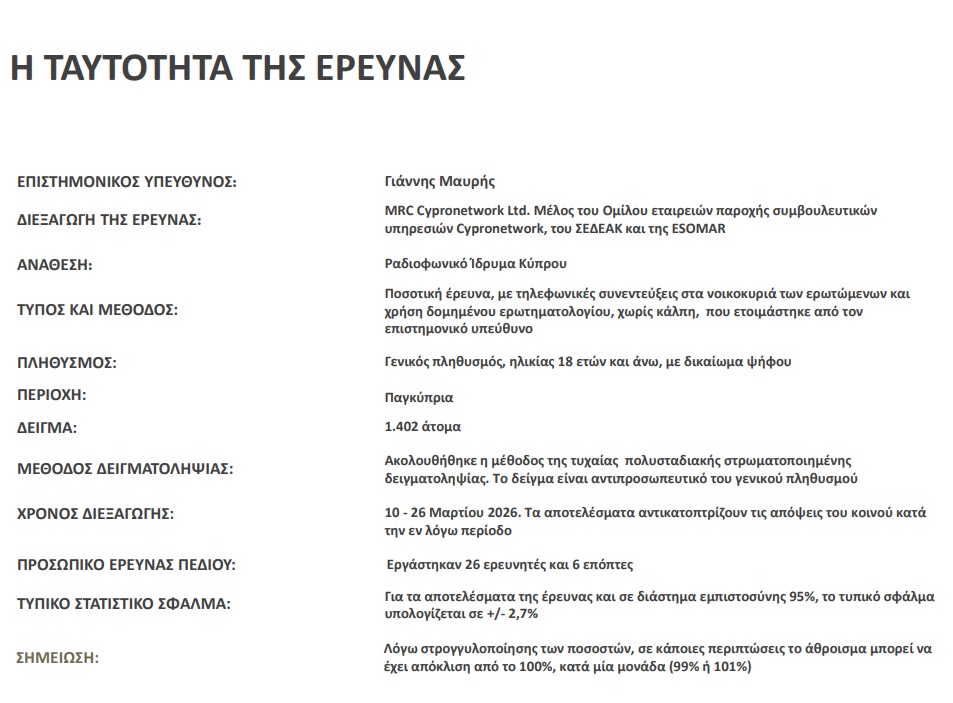 Η έρευνα γνώμης πραγματοποιήθηκε τηλεφωνικώς σε παγκύπριο επίπεδο, μεταξύ 10 - 26 Μαρτίου 2026, με δείγμα 1402 άτομα ηλικίας άνω των 18 ετών που έχουν δικαίωμα ψήφου. Ακολουθήθηκε η μέθοδος της τυχαίας πολυσταδιακής στρωματοποιημένης δειγματοληψίας. Το δείγμα είναι αντιπροσωπευτικό του γενικού πληθυσμού. Για τα αποτελέσματα της έρευνας και σε διάστημα εμπιστοσύνης 95%, το τυπικό σφάλμα υπολογίζεται σε +/- 2,7%.