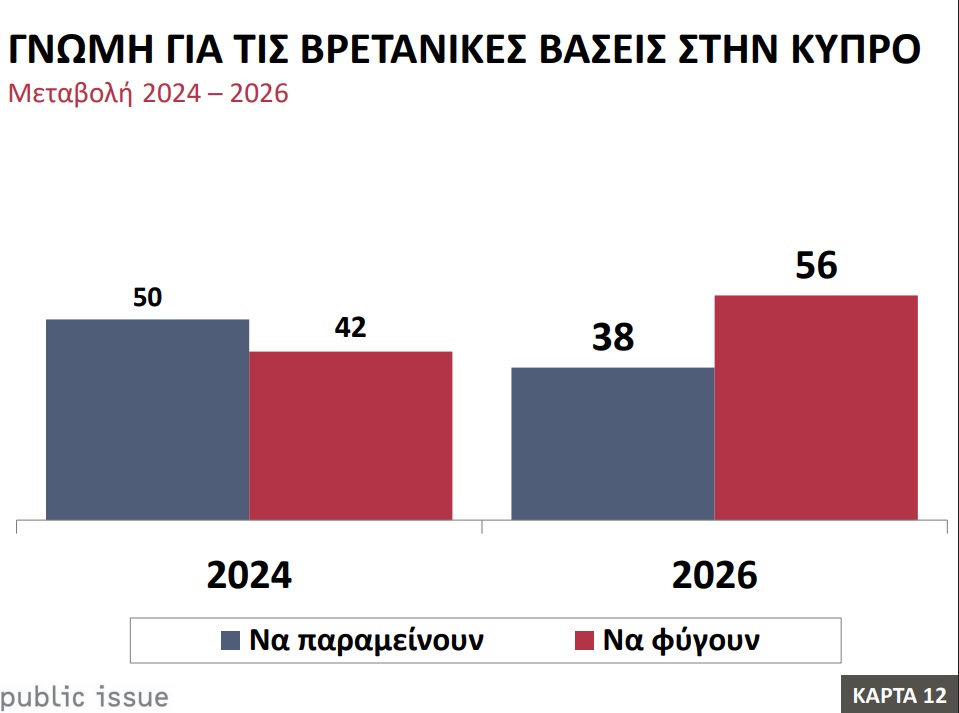 Το 56% των συμμετεχόντων στην έρευνα δήλωσε ότι πρέπει να φύγουν οι Βρετανικές Βάσεις από την Κύπρο, ενώ το 38% υποστήριξε ότι πρέπει να παραμείνουν.