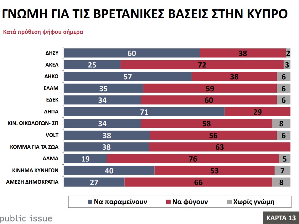 Να παραμείνουν οι Βρετανικές Βάσεις στην Κύπρο δήλωσε το 60% των ψηφοφόρων του ΔΗΣΥ, το 57% του ΔΗΚΟ και το 71% της ΔΗΠΑ. Να φύγουν οι βάσεις ζητά το 72% των ψηφοφόρων του ΑΚΕΛ, το 76% του ΑΛΜΑ, το 66% της Άμεσης Δημοκρατίας, το 59% του ΕΛΑΜ, το 60% της ΕΔΕΚ, το 58% των Οικολόγων και το 56% του Volt.