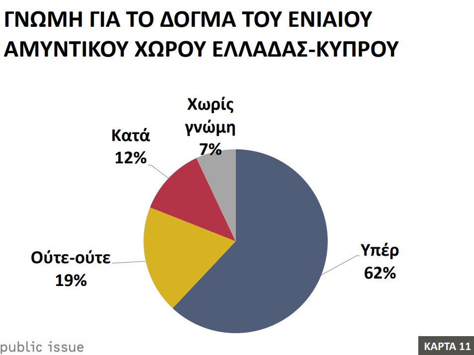 Υπέρ του δόγματος για ενιαίο αμυντικό χώρο Ελλάδας και Κύπρου τάσσεται το 62%, ενώ κατά τοποθετείται μόνο το 12%, με το 19% να κρατά ουδέτερη στάση και το 7% να μην εκφράζει γνώμη.