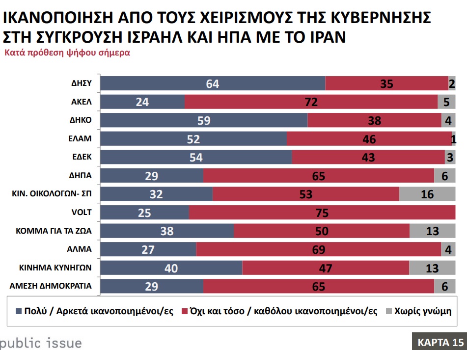 Πολύ/αρκετά ικανοποιημένο με τους χειρισμούς της κυβέρνησης Χριστοδουλίδη στο θέμα του πολέμου στη Μέση Ανατολή δήλωσε το 64% των ψηφοφόρων του ΔΗΣΥ, το 59% του ΔΗΚΟ, το 54% της ΕΔΕΚ και το 52% του ΕΛΑΜ. Αντίθετα, ότι και τόσο/καθόλου ικανοποιημένο δήλωσε το 72% του ΑΚΕΛ, το 65% της ΔΗΠΑ και της Άμεσης Δημοκρατίας, το 75% του Volt, το 69% του ΑΛΜΑ και το 53% των Οικολόγων.