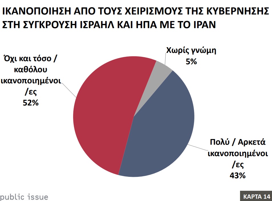Συνολικά ο βαθμός ικανοποίησης με τους χειρισμούς της κυβέρνησης φτάνει στο 43%, ενώ όχι και τόσο/καθόλου ικανοποιημένο δηλώνει το 52%.