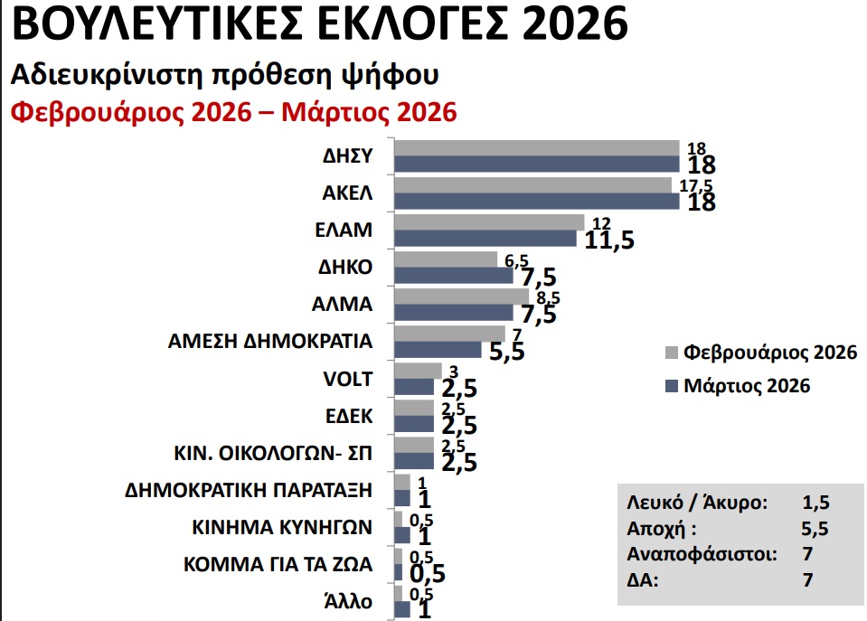 Συγκεκριμένα, ο ΔΗΣΥ και το ΑΚΕΛ στην πρόθεση αγγίζουν το 18%, ακολουθεί το ΕΛΑΜ με 11,5%, ενώ το ΔΗΚΟ και το ΑΛΜΑ δίνουν σκληρή μάχη για την τέταρτη θέση με 7,5% αντίστοιχα. Η Άμεση Δημοκρατία λαμβάνει ποσοστό 5,5% και ακολουθούν το Volt, η ΕΔΕΚ και το Κίνημα Οικολόγοι – Συνεργασία Πολιτών με 2,5%. Η ΔΗΠΑ και το Κίνημα Κυνηγών βρίσκονται στο 1%. Οι αναποφάσιστοι αγγίζουν το 7%, το 5,5% δηλώνει ότι θα τηρήσει αποχή, το 1,5% θα ρίξει λευκό ή άκυρο και το 7% δεν απαντά.